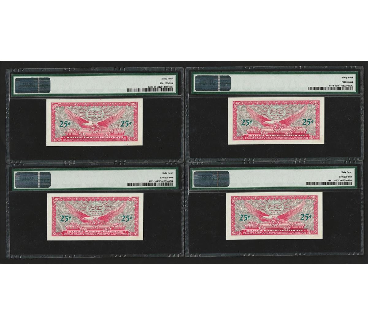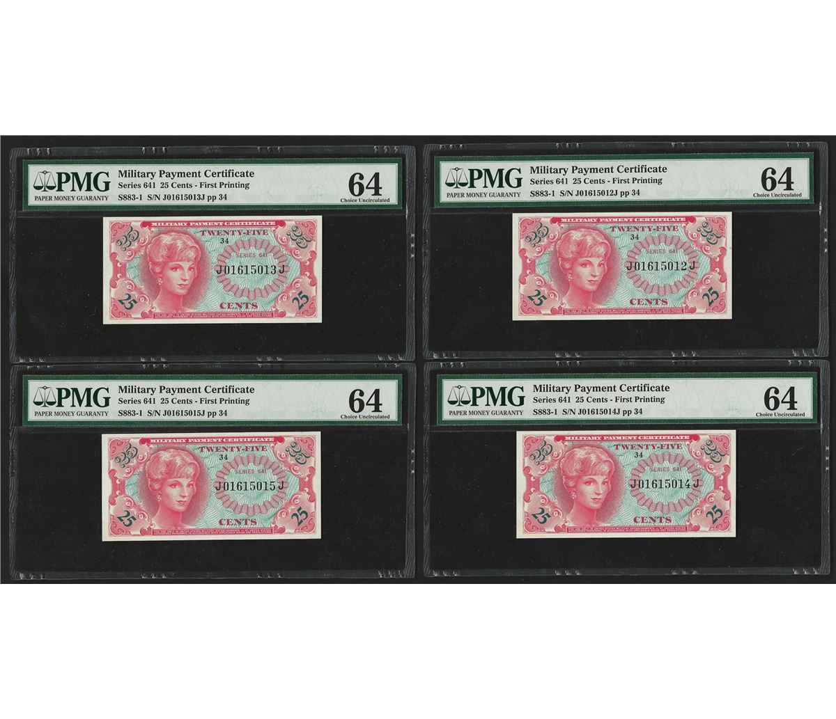 One (4) Consecutive 25 Cents Military Payment Certificates Series 641 PMG Choice Unc 64. PMG Certified.