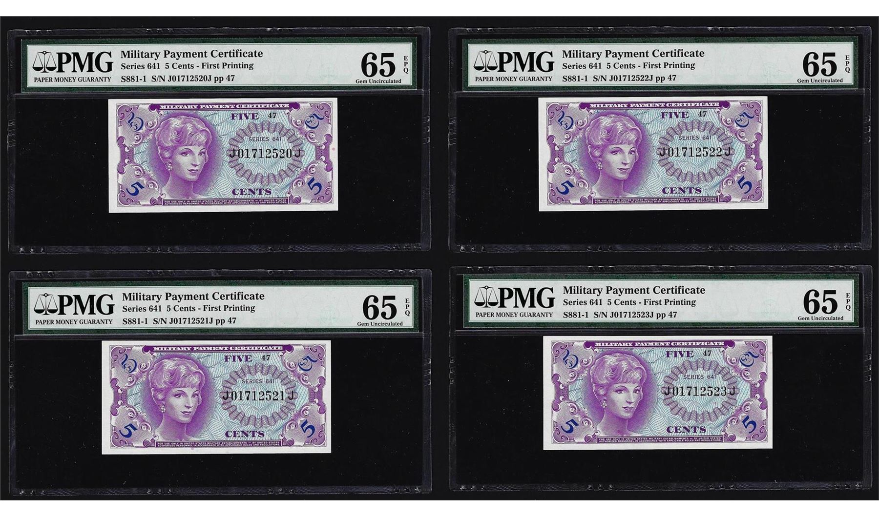 One (4) Consecutive 5 Cents Military Payment Certificates Series 641 PMG Gem Unc 65EPQ. PMG Certified.