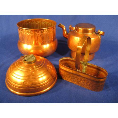 4 Copper items, One signed “Wafax”, handmade teapot etc.