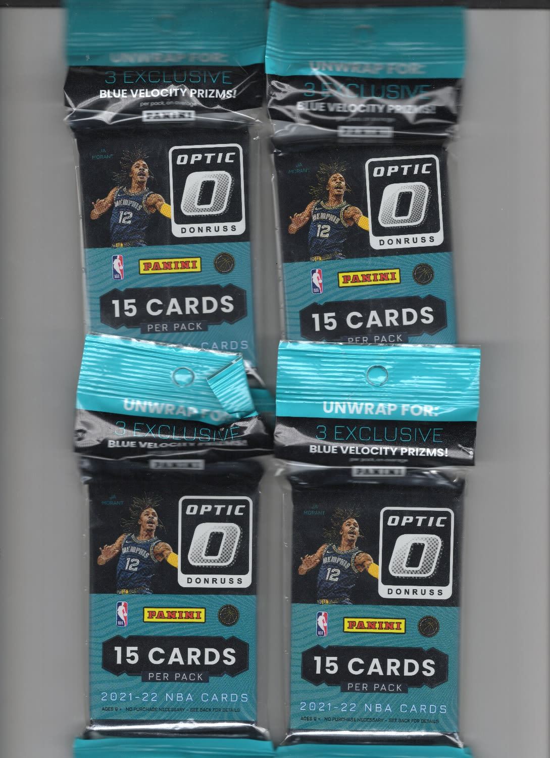 4 Count of 2021-2022 Donruss Optic Basketball Cello Value Packs. 4 Packs of 15 Cards per Pack. 3 Blu