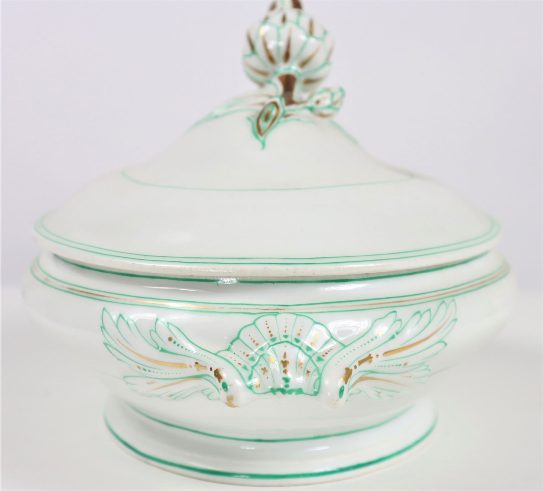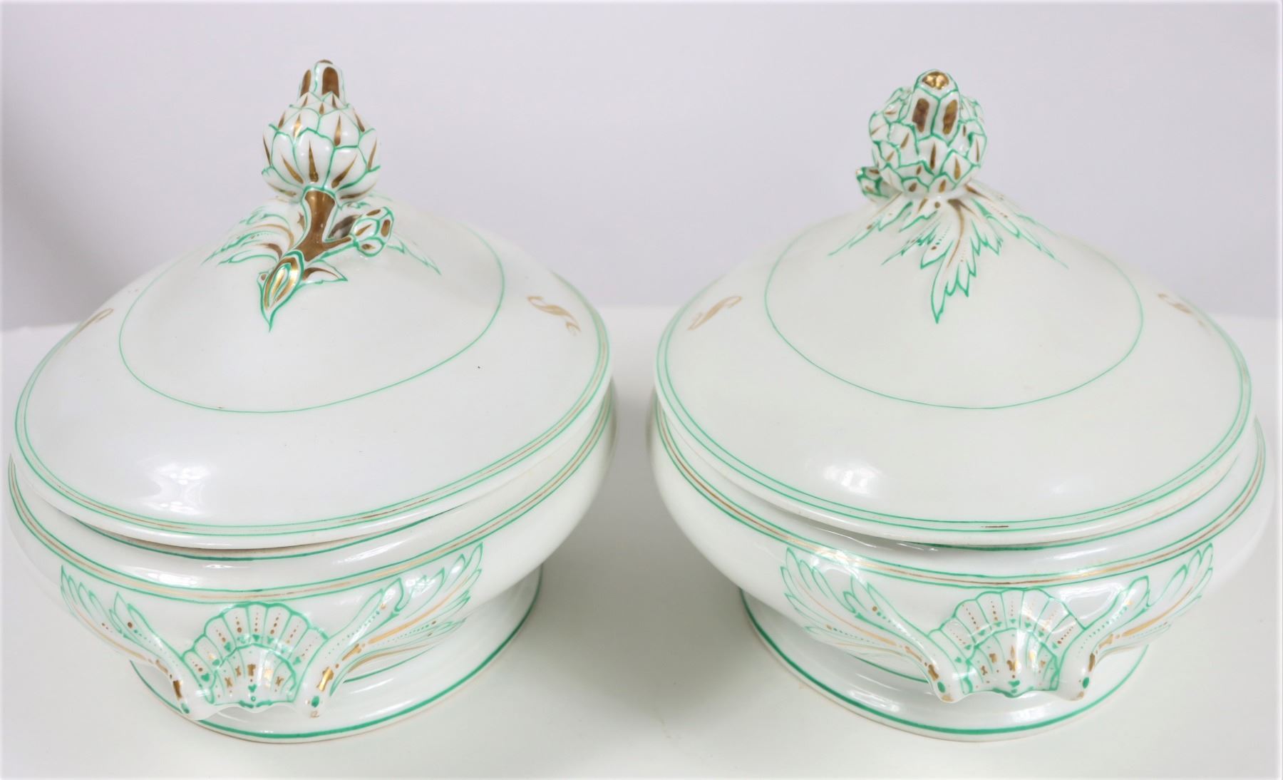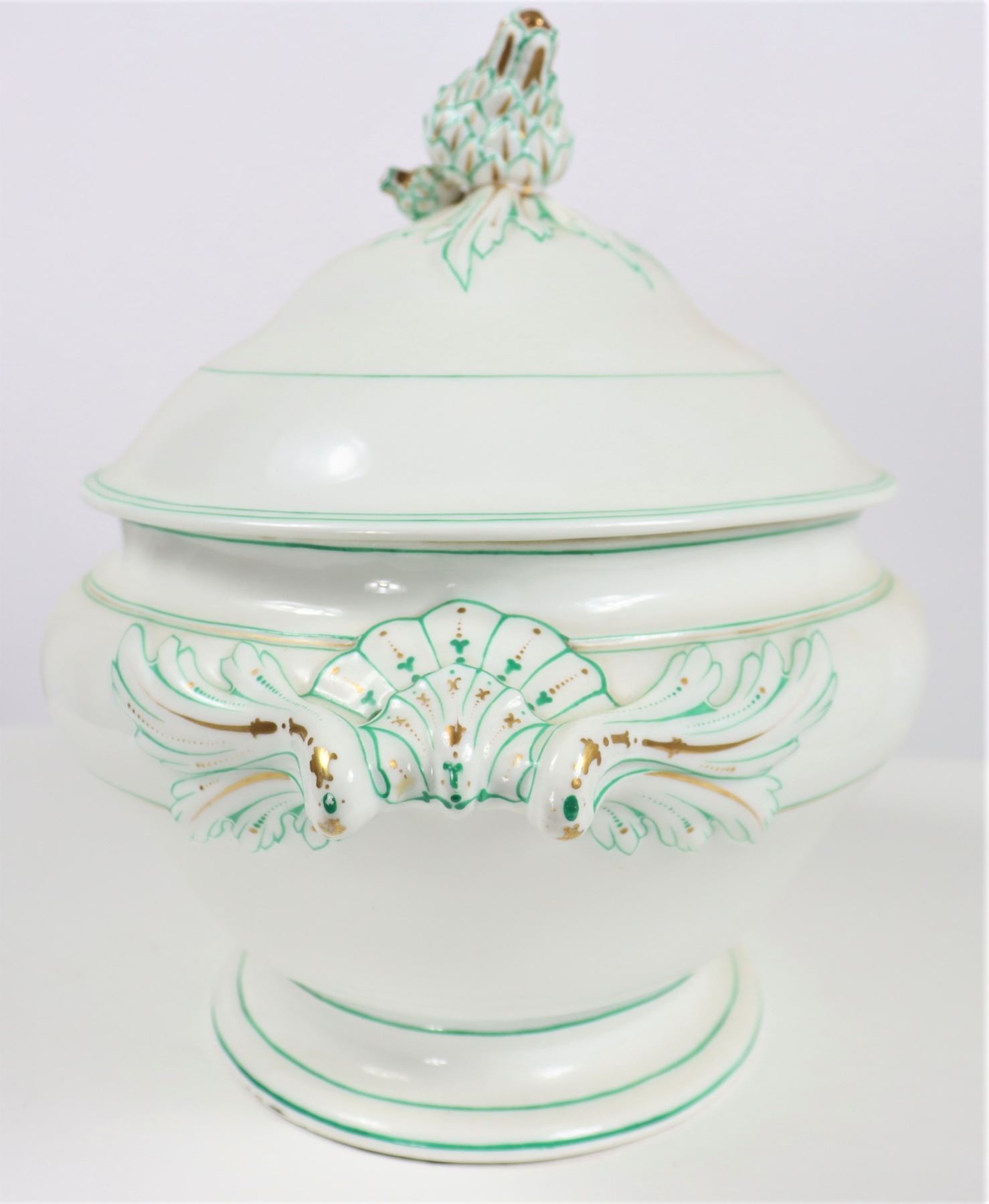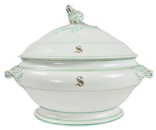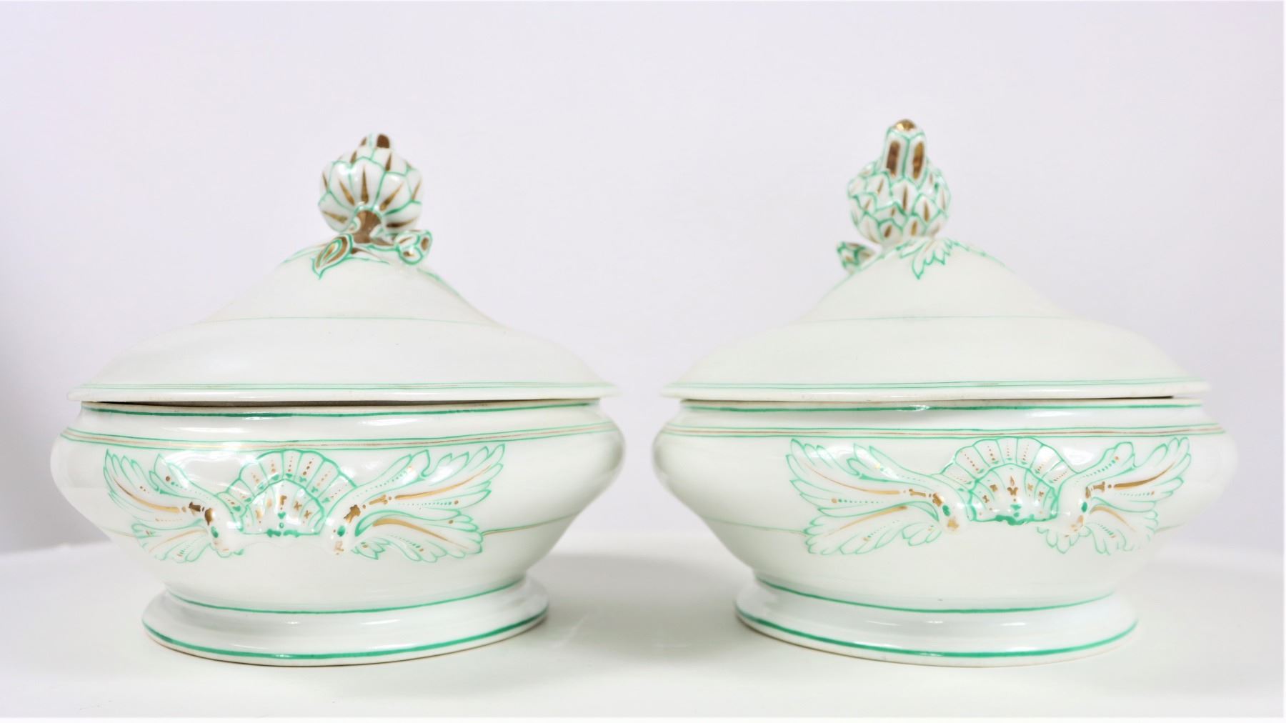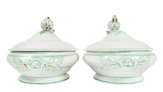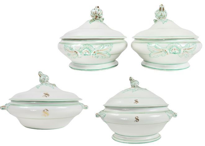 Group of (4) porcelain covered tureens with pinecone finials.