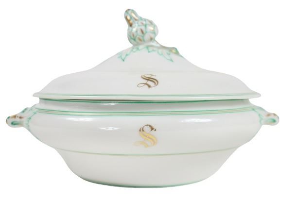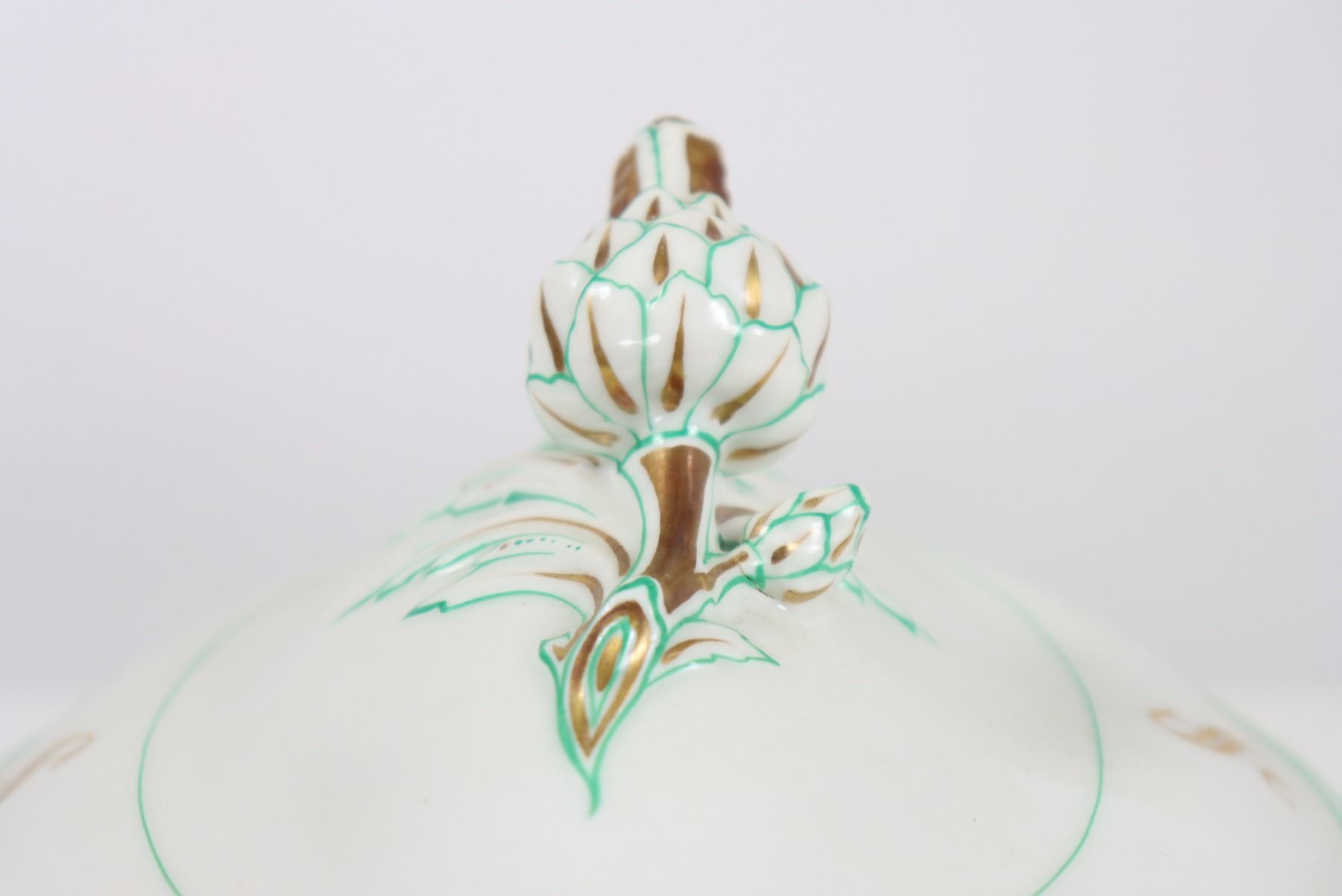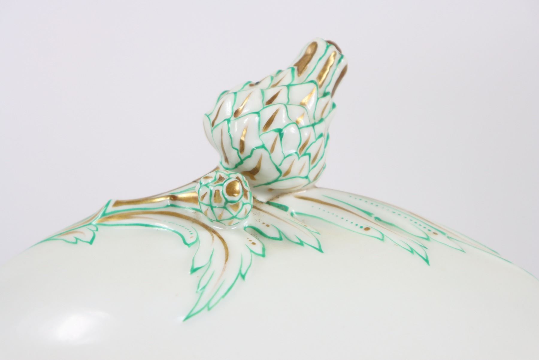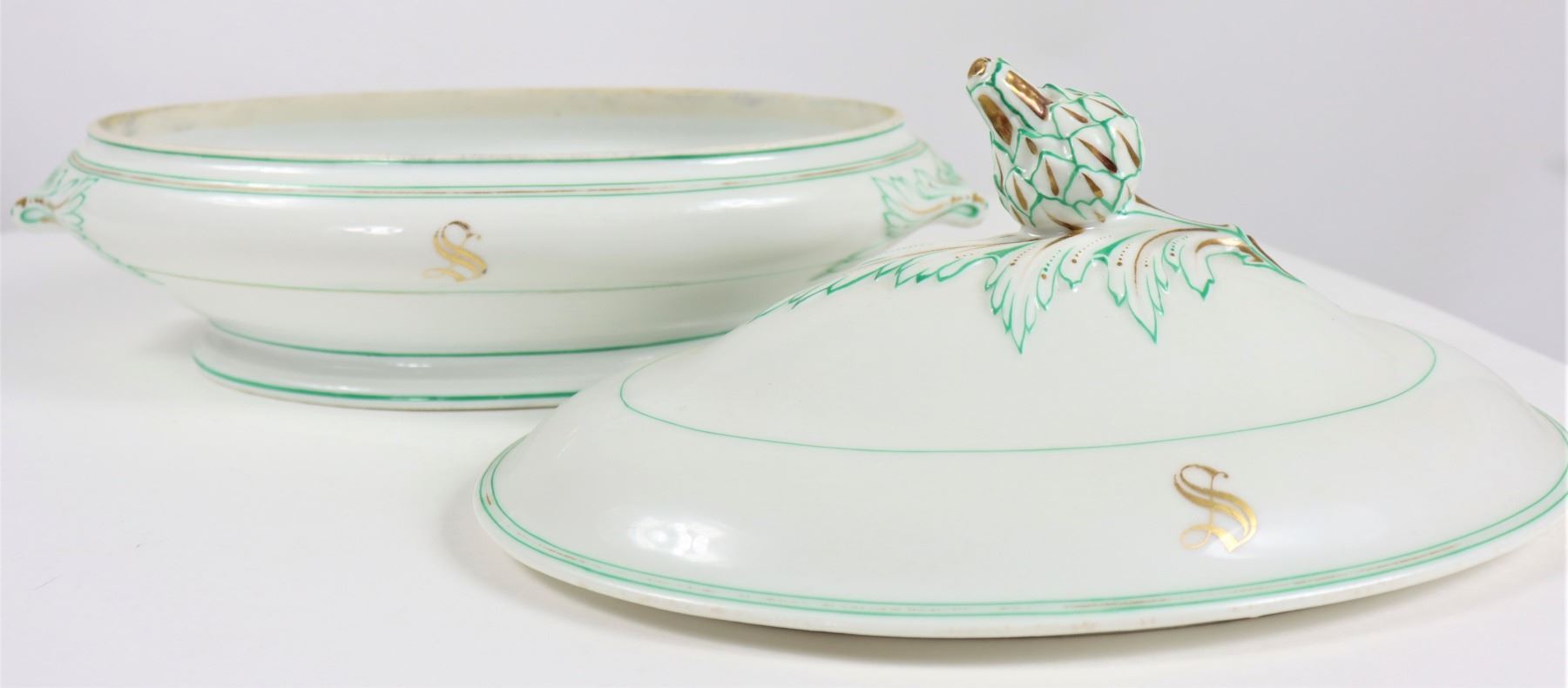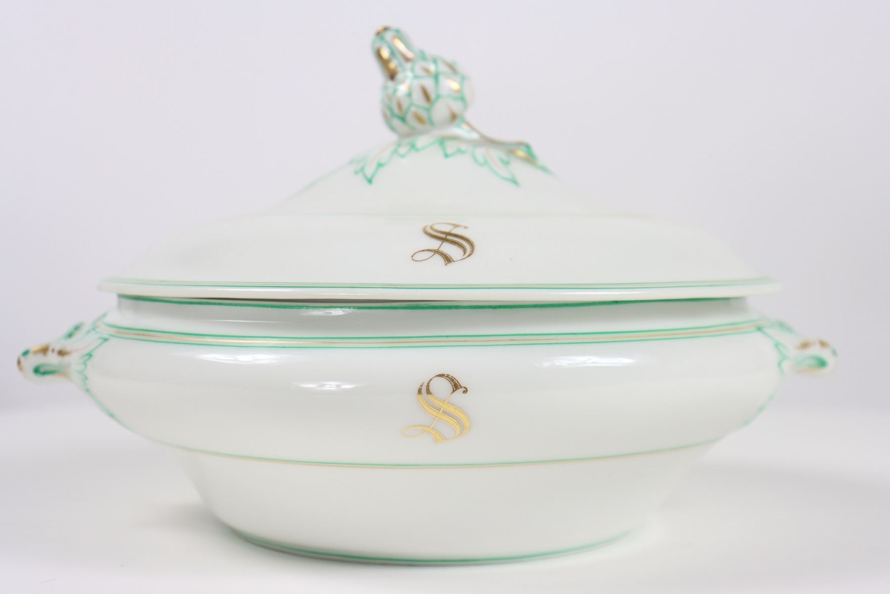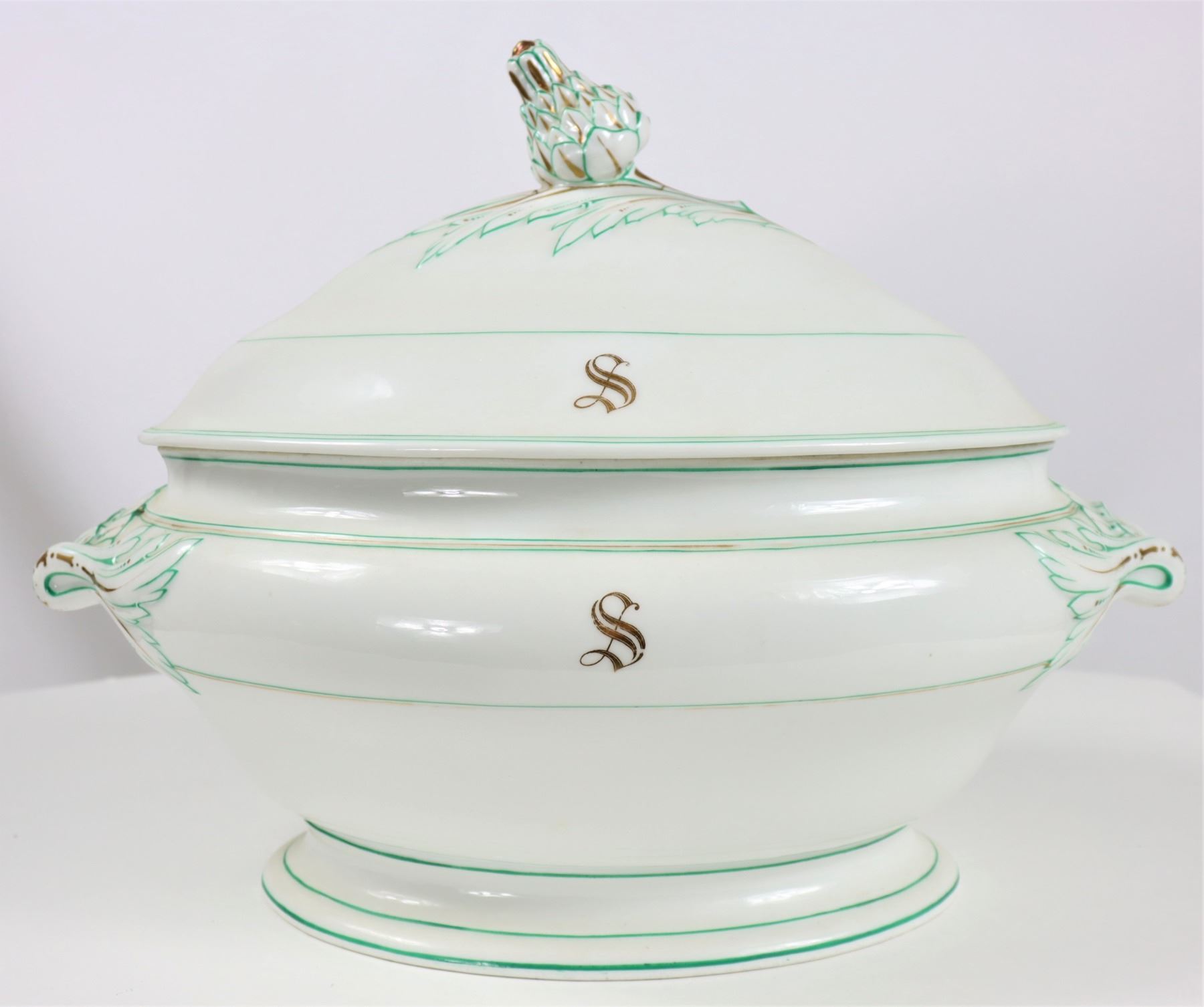 Group of (4) porcelain covered tureens with pinecone finials.