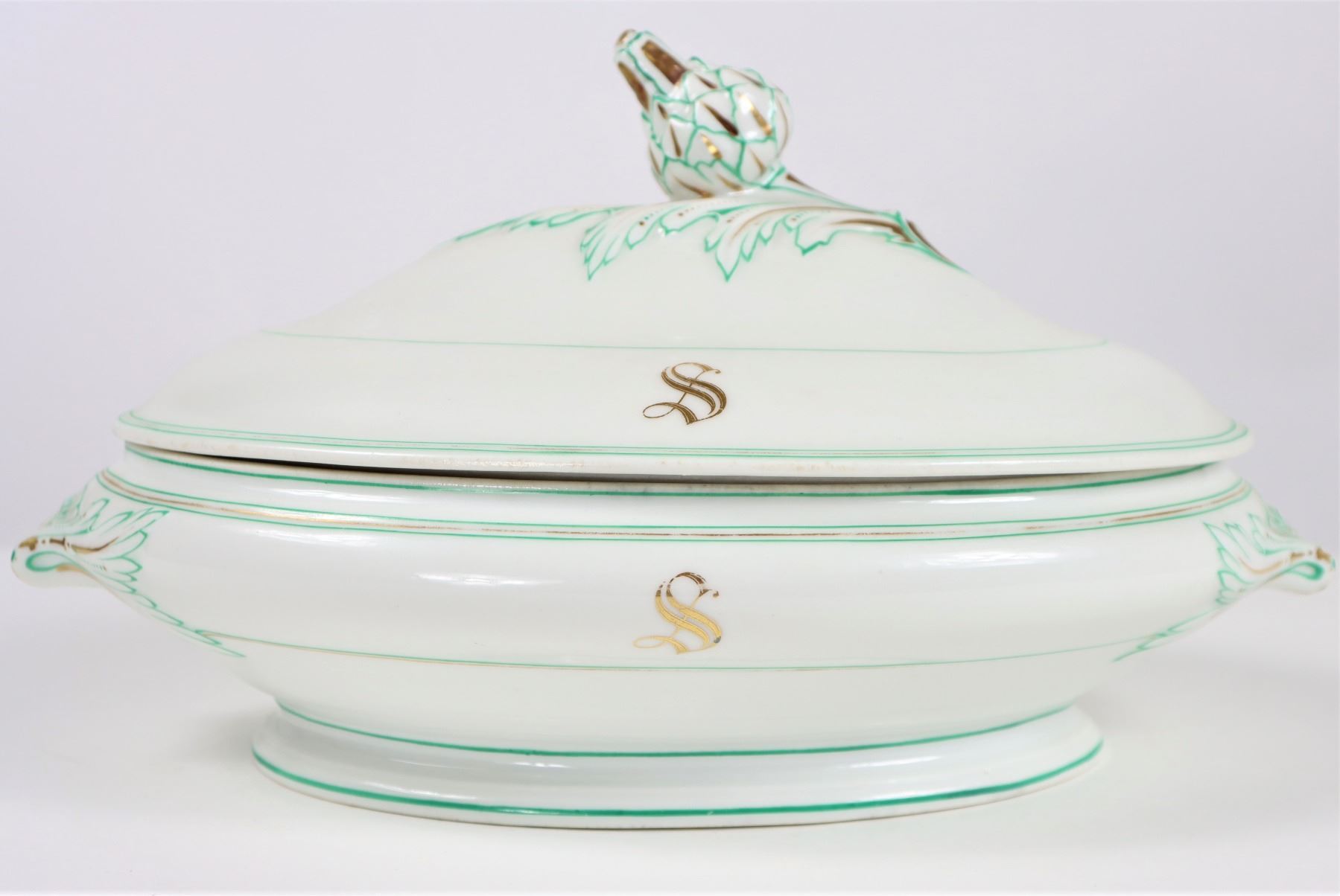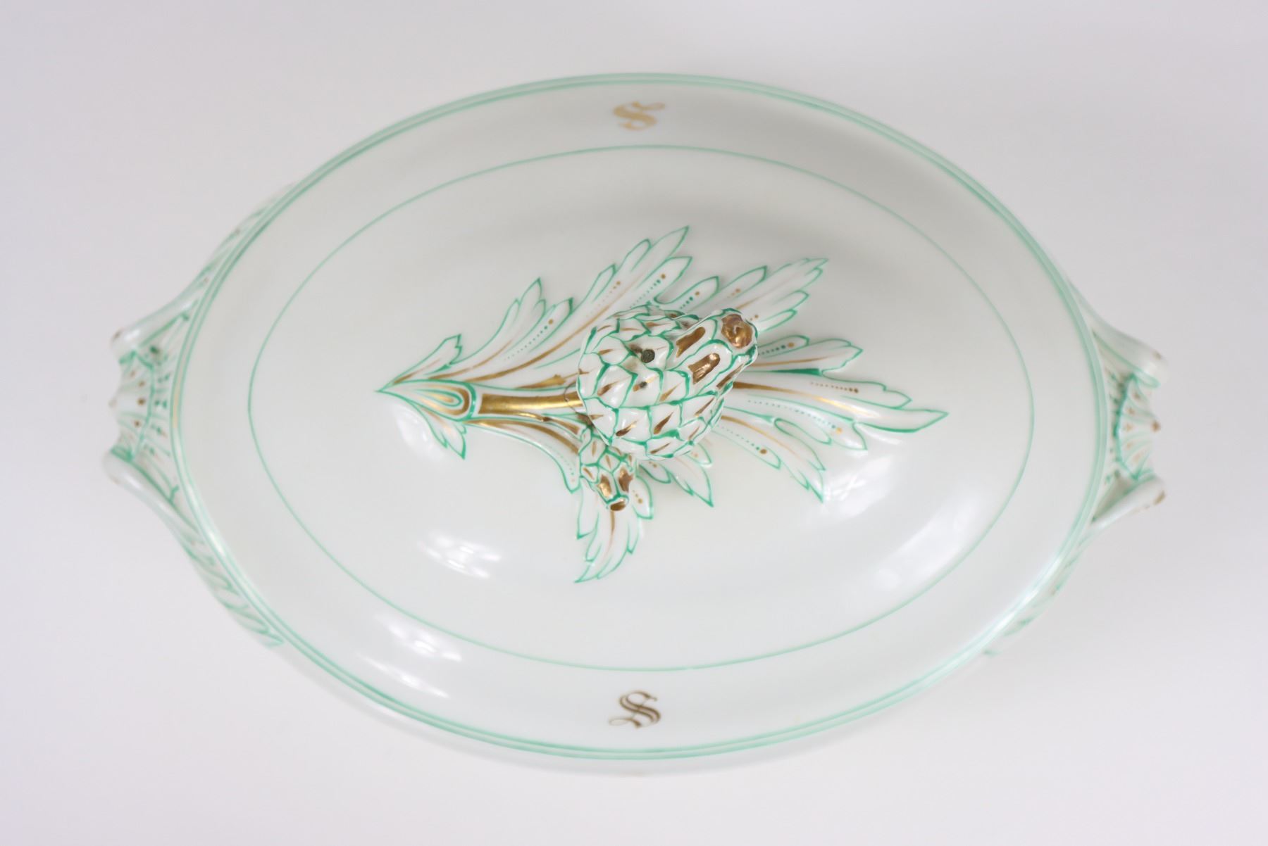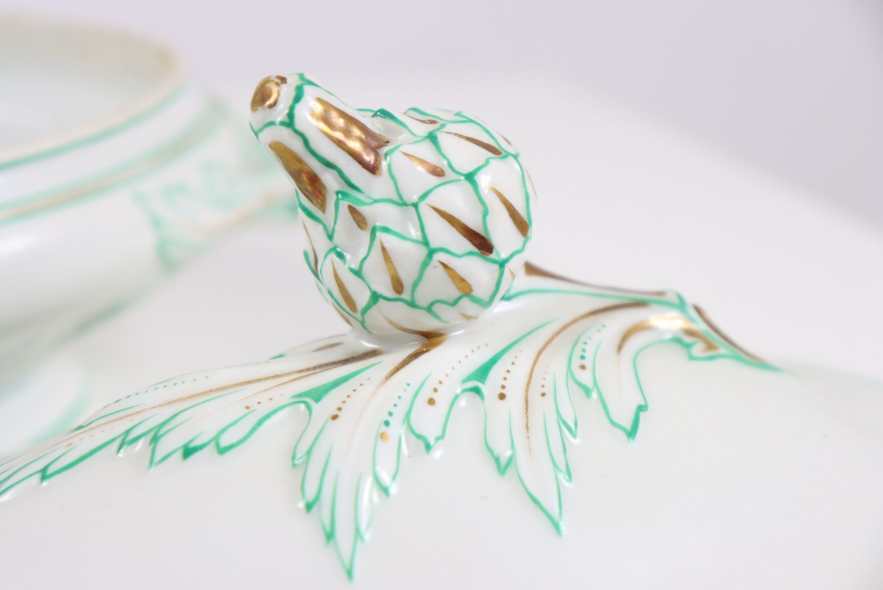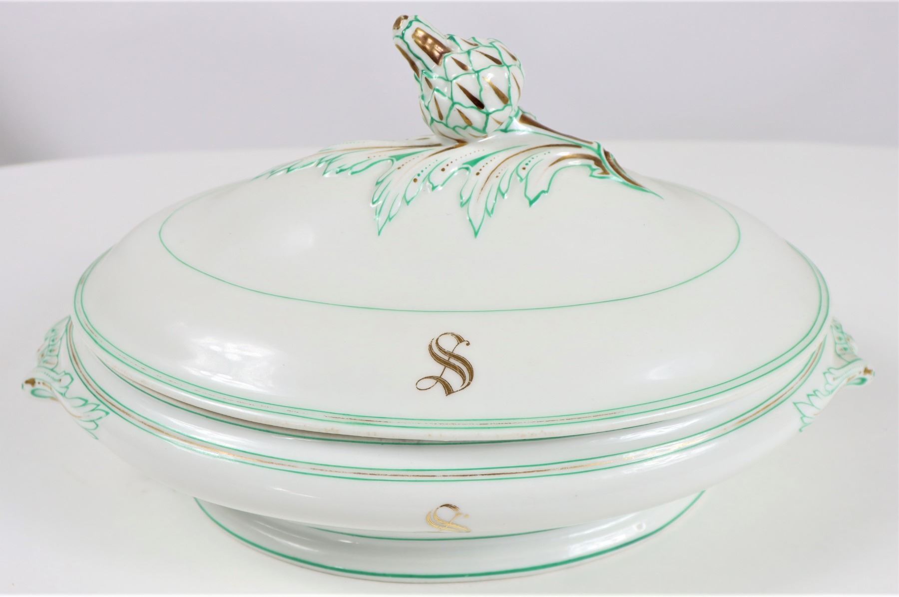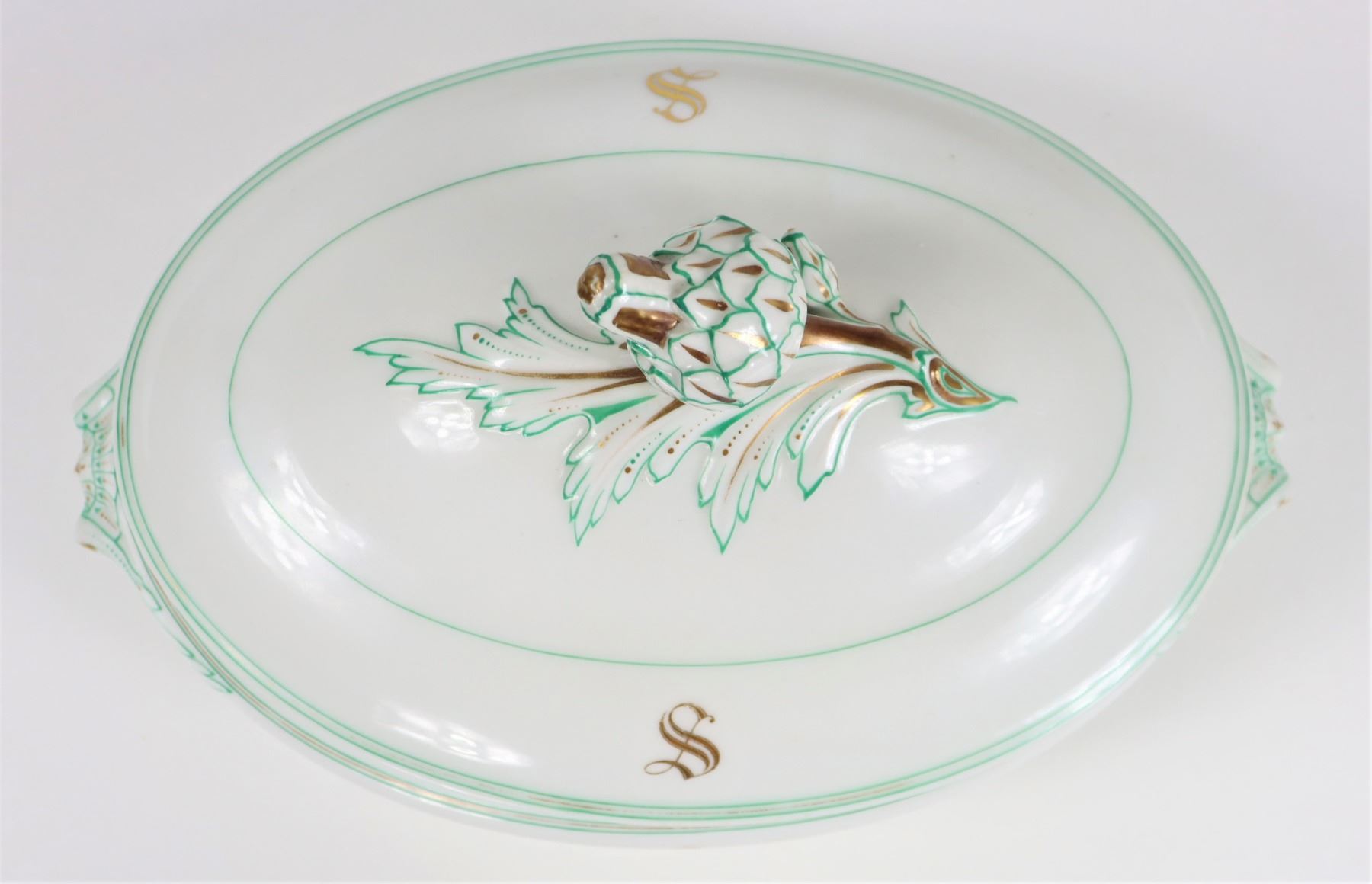 Group of (4) porcelain covered tureens with pinecone finials.