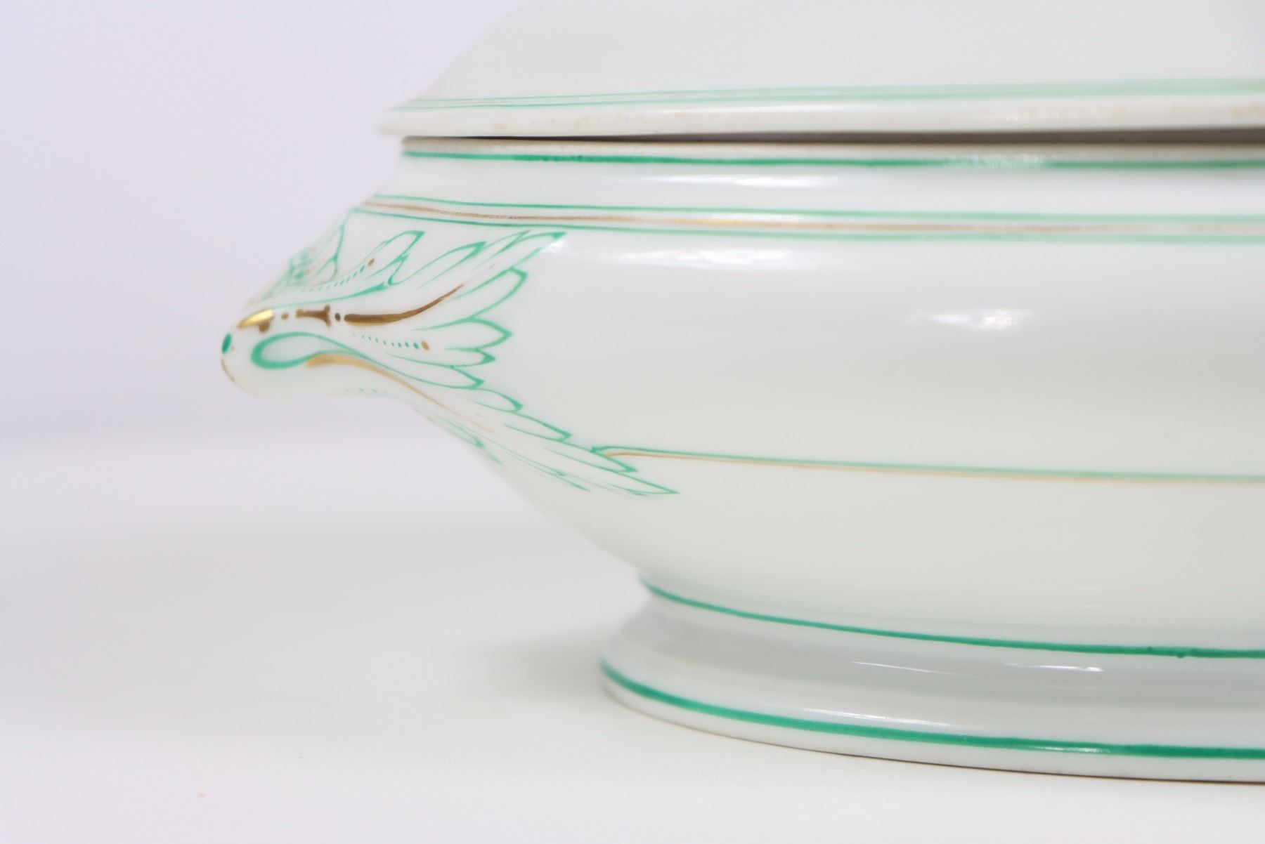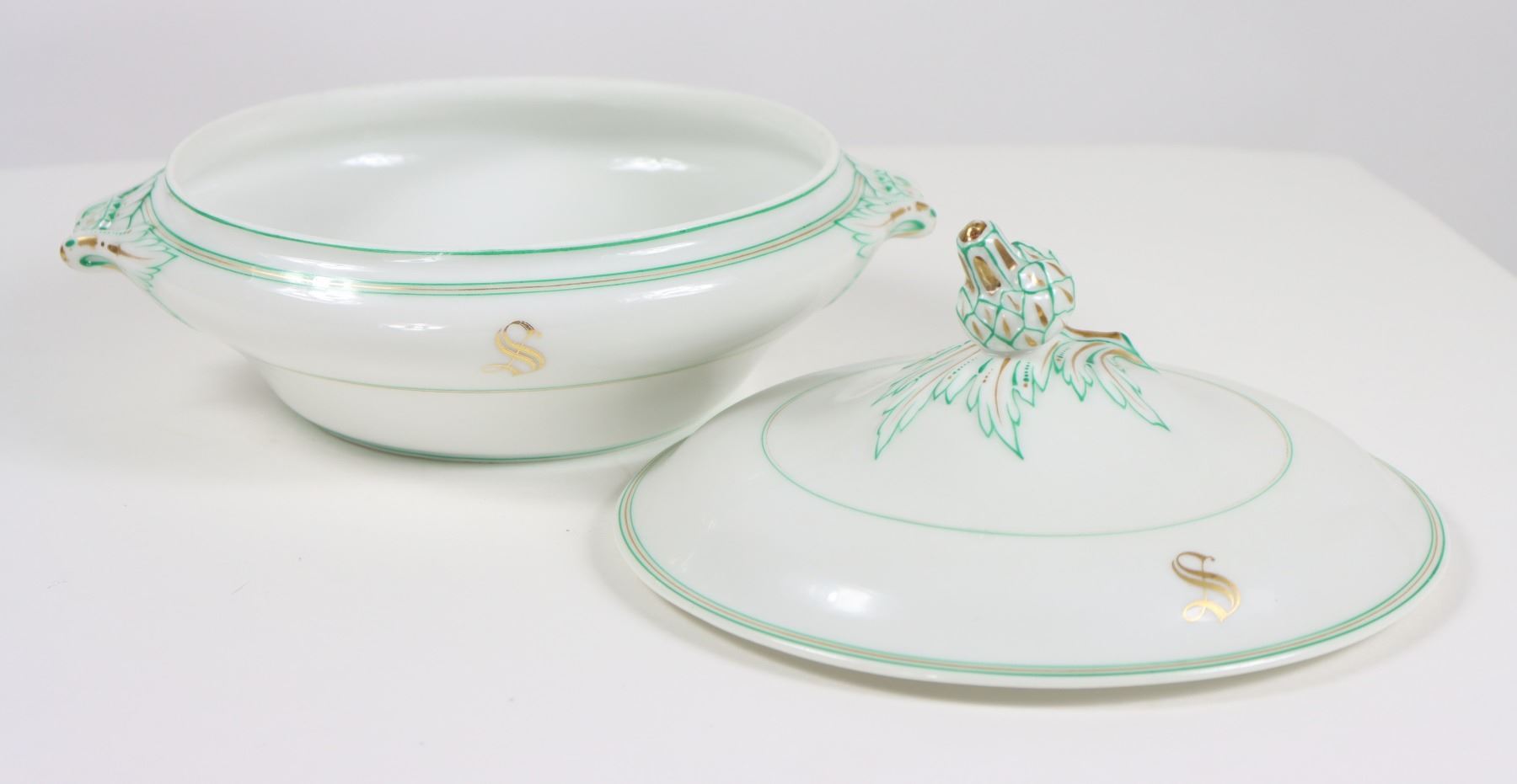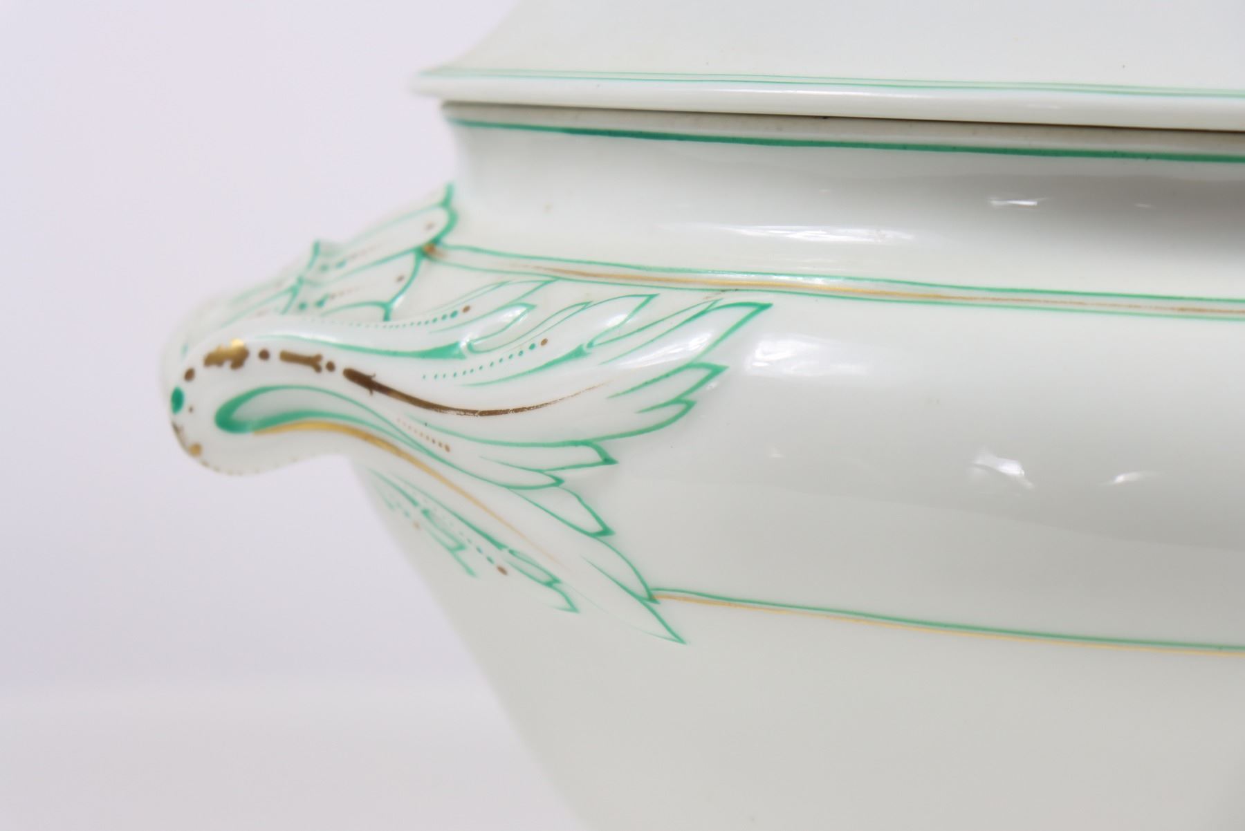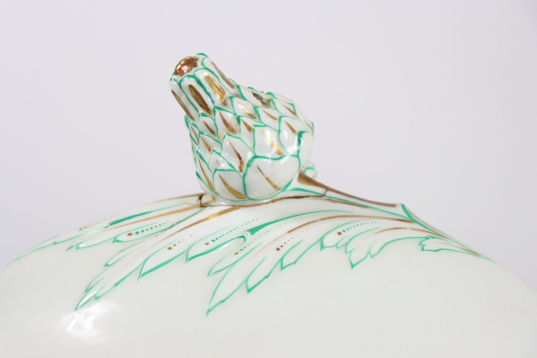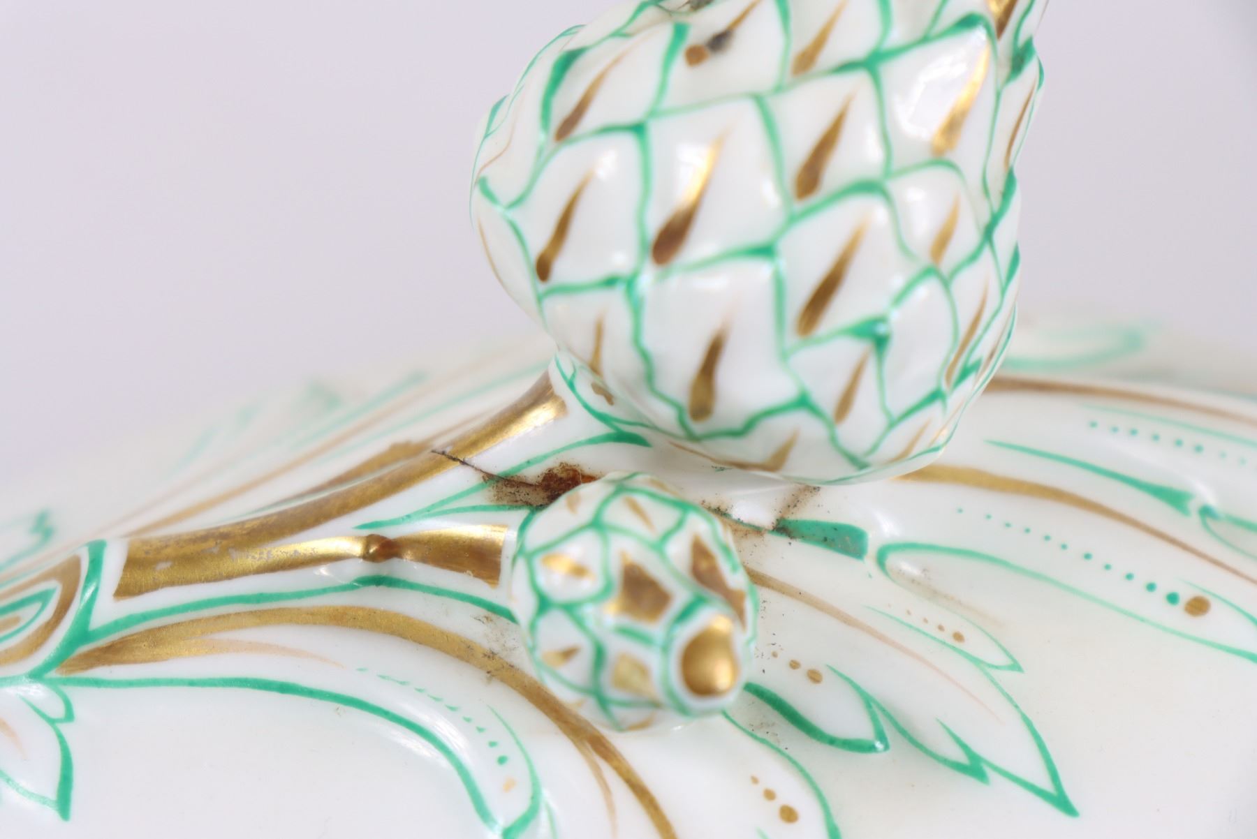 Group of (4) porcelain covered tureens with pinecone finials.
