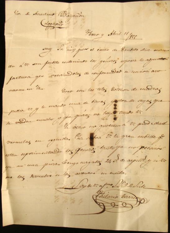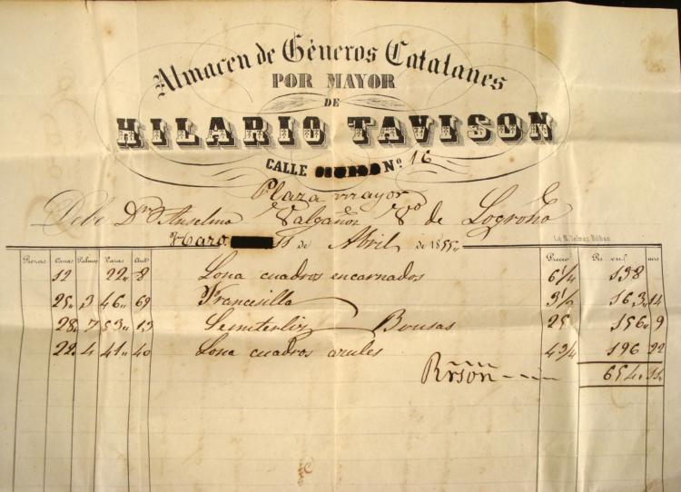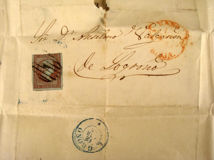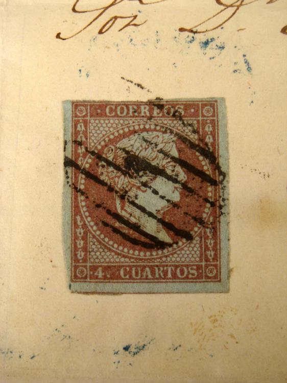 Here is a Spanish stamp on the back of a Hand-Written Invoice, from Almac n de G neros Catalane. It is 4 quarters, and has a cancellation dated the same as the stamp. * 1855 Correos 4 Cuartos