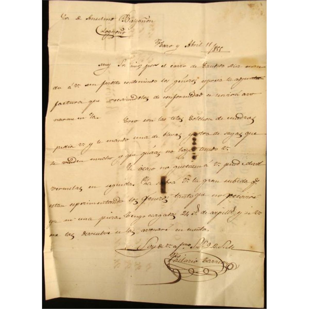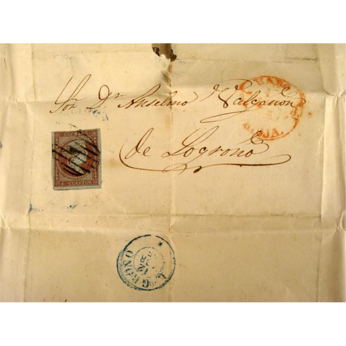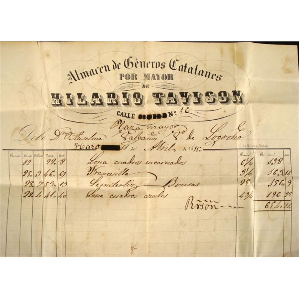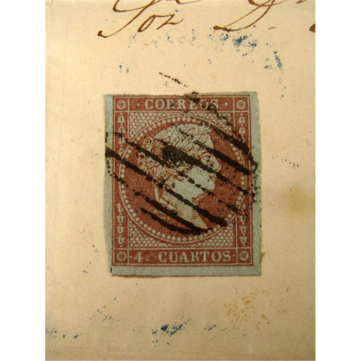 Here is a Spanish stamp on the back of a Hand-Written Invoice, from Almac n de G neros Catalane. It is 4 quarters, and has a cancellation dated the same as the stamp. * 1855 Correos 4 Cuartos
