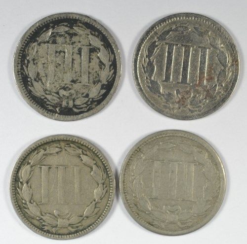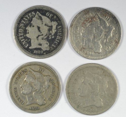 4 DIFFERENT THREE CENT NICKELS ( 65,66,67,73) AG-VG
