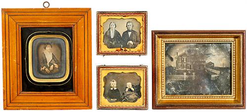4 Daguerreotypien, 1850-55 1) 1/2-Platte, um 1850, Außenaufnahme eines Anwesens mit Pferdekutsche, amerikanische Südstaaten. - 2) 1/6-Platte, um 1850, nicht geöffnet! Damenportrait, vermutlich französisch. - Und: 3-4) 1/6-Platte, um 1855, Ehepaar und Kinder, Case mit floralem Muster.