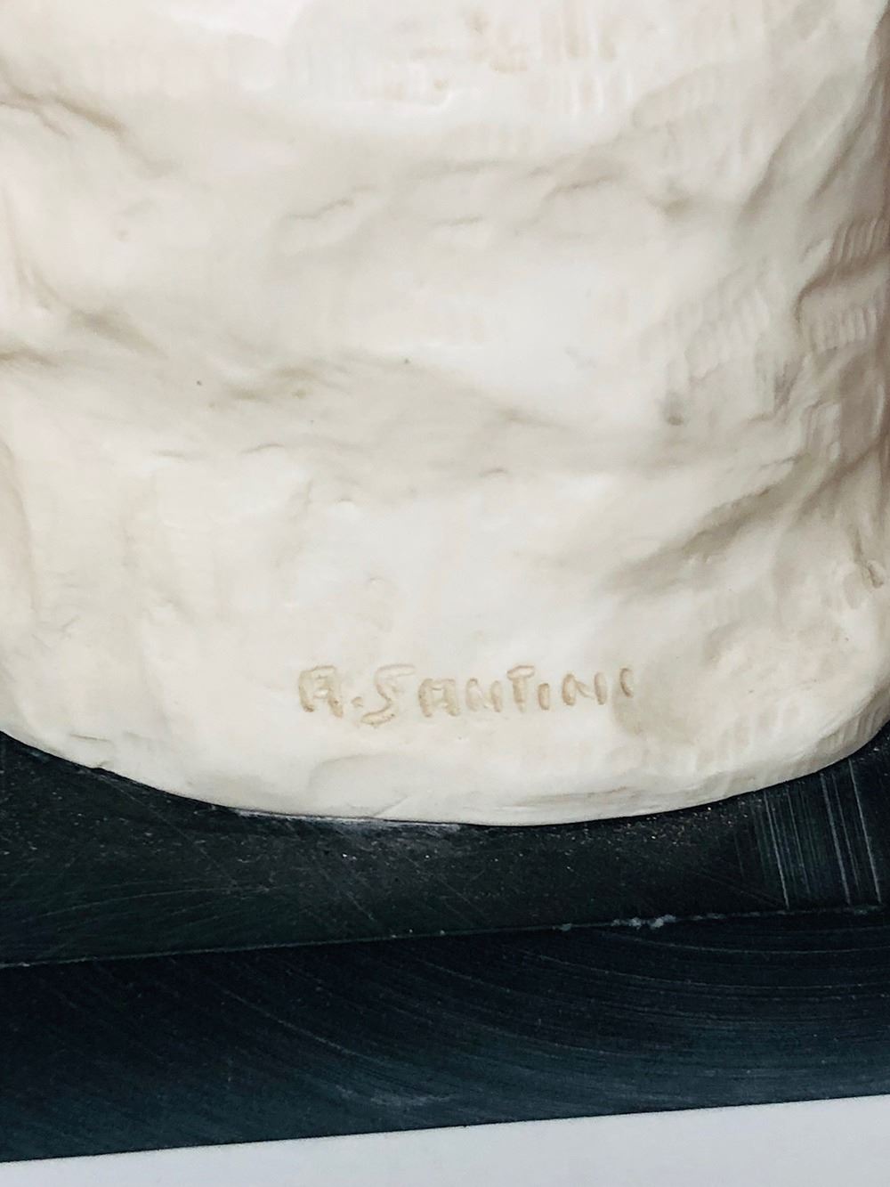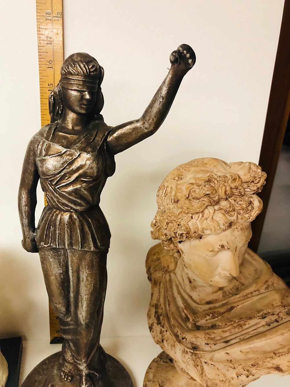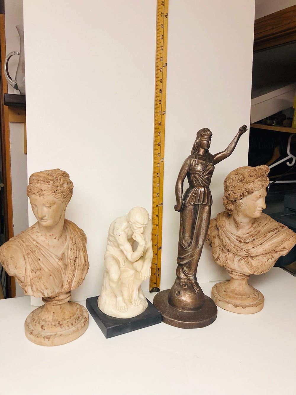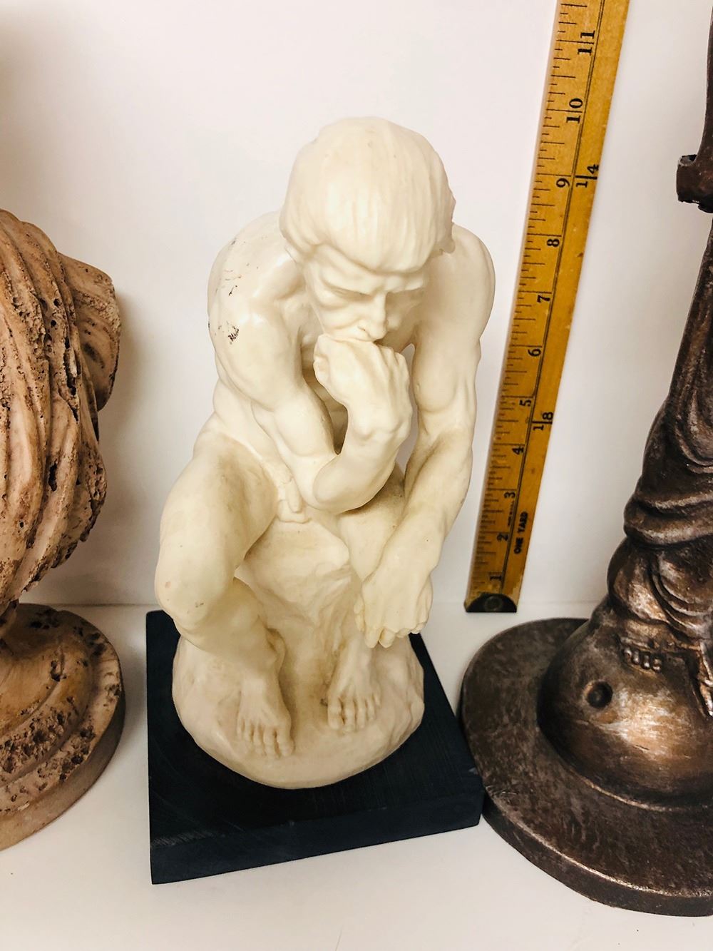 4 Decorative statues includes 2 Romanesque busts, Lady Justice, and The Thinking Man (signed).