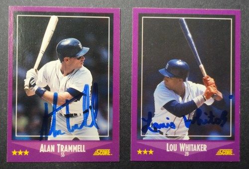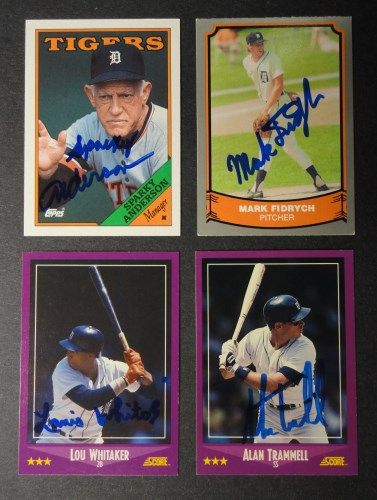 All Original Autographed Baseball Cards: '88 Topps Sparky Anderson , '88 Score Alan Trammell & Lou Whitaker, '88 Pacific Mark Fidrych, Nice condition, Est $30-$40