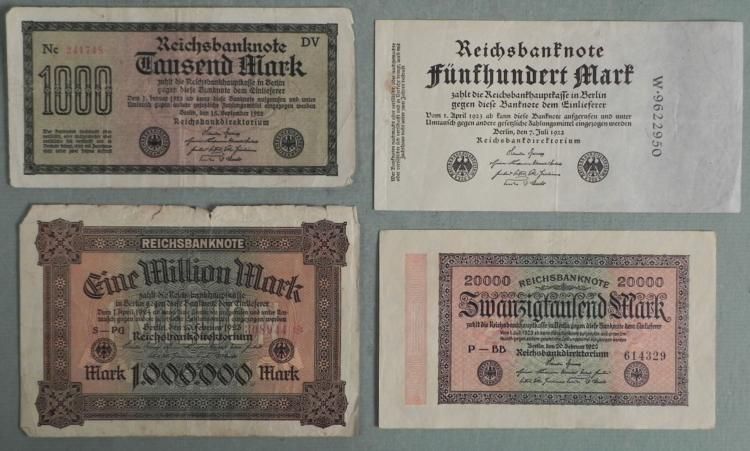 4 Different German 1923 Paper Money * 500 Marks1000 Marks20000 Marks1,000,000 Marks *