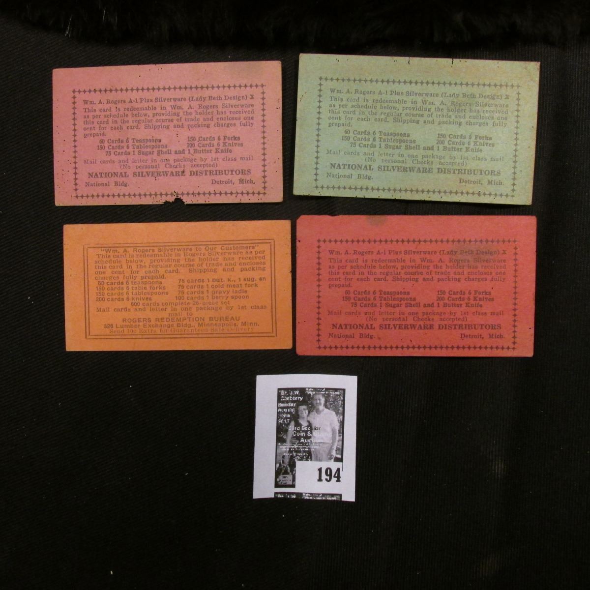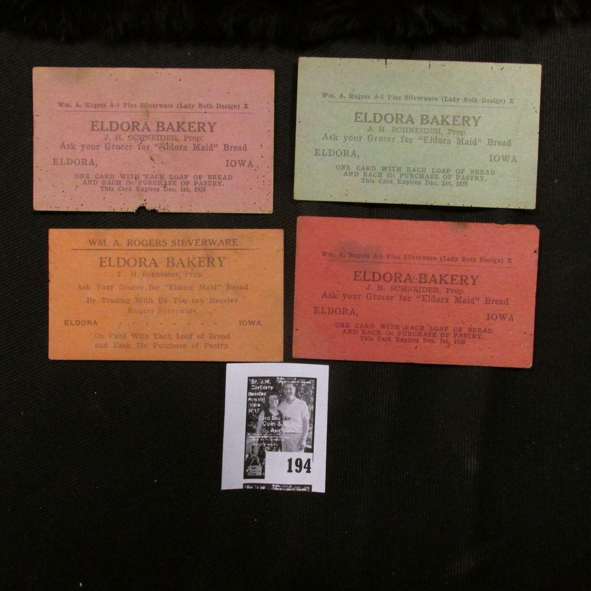 (4) Different "Wm. A. Rogers Silverware Eldora Bakery…Eldora, Iowa" Scrip, "On Card with Each Loaf of Bread and Each 15c Purchase of Pastry." (1935) "National Silverware Distributors National Bldg. Detroit, Mich."