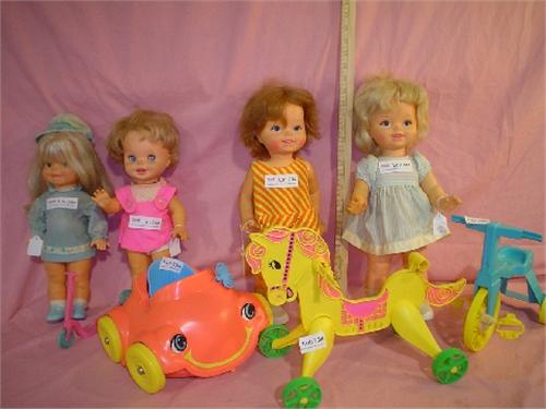 4 Dolls. 3 have painted eyes & 1 w/moveable eyes. Vinyl/Plastic. "Baby Small Walk" by Mattel (right leg is loose) 1967 & 1964, "Talking Baby First Step" by Mattel 1967 & 1964 (legs are a little loose), 1973 Mattel Doll - 1972 on back & 1972 Mattel Doll. Also, "Bumpety Buggy" Car for Baby Go Bye-Bye by Mattel 1969 & "Tippee Toes Horse & Trike" by Mattel 1967 & Scooter 1968. Mattel Doll in Pink is "Saucy" and Doll in blue is "Cathy Quick Curl"