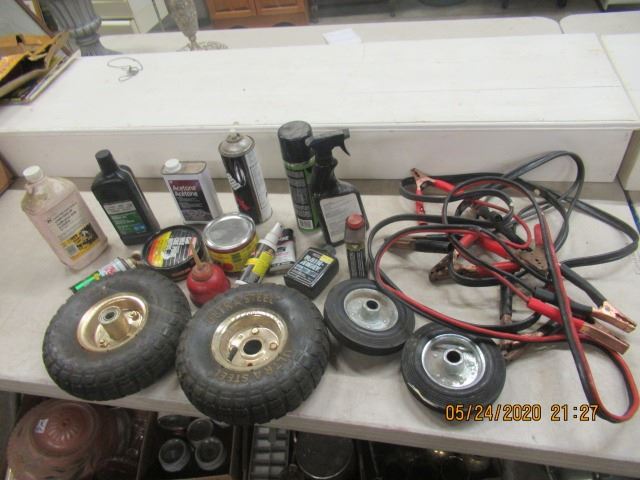 4 Dolly Wheels, Auto Fluids, Lubes & Cleaner 2) Booster Cables
