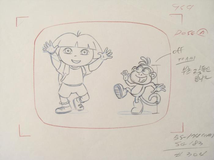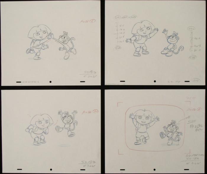 Dora is shown here with her friend Boots, playing, dancing, and giving a high five. The red lines show which direction their movement will be.Medium: Black and non photo blue pencil on white paper, with animator notations in black and red pencil; peg holes on the bottomSize: 10 1/2 x 12 1/2 inchesCertificate of Authenticity includedCondition: Very good, with a couple creasesDora and Boots certainly have fun together, and it shows on these fun original drawings!