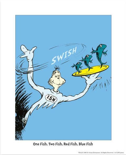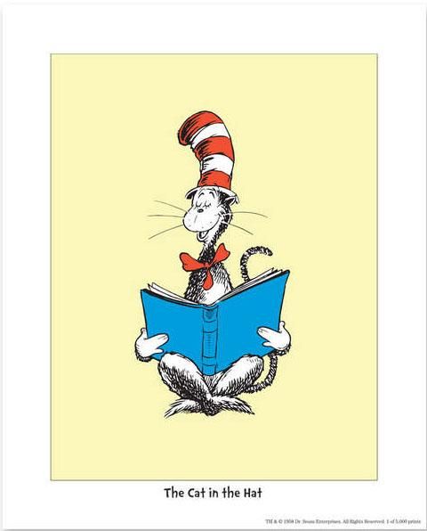 Young or old, tall or smalls, give the gift of Seuss for your halls and walls. Inspire giggles and wiggles with characters from four favorite Dr. Seuss books. Horton Hears a Who!, One Fish Two Fish Red Fish Blue Fish, The Cat in the Hat, and Fox in Socks. Let their bright personalities come to life on your wall in a rainbow of color or on a classic white background to suit every shade of paint for your liking.Offered here are four different prints from a variety of Dr. Seuss books. They are: Horton Hears a Who!, Cat in the Hat, Fox in Socks, One Fish Two Fish.About the PrintsCrafted in the USA on richly textured, acid-free, 30% recycled paperAccompanied by Artist's BiographyAccompanied by Artwork CertificatePrinted using today's most vibrant inks to produce a brilliant reproductionSizes: 8.5" x 10.5"Condition: MintThe prints are ready to be matted and framed. A perfect gift for the holidays that will put a smile on your child or teens face. Customize a room any way you like, the possibilities are endless.