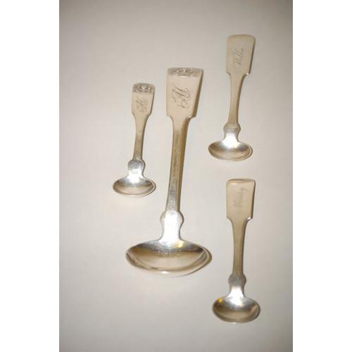 (4) EARLY AMERICAN SILVER TABLE ITEMS - (1) 3 1/4" SALT SPOON & (1) 6" SAUCE LADLE BY PETER P. HAYES (1788-1842) POKEEPSIE W/ BASKET OF FLOWERS DECORATION (MONOGRAMMED) & (2) 3 3/4" SALT SPOONS BY E. WHEELER (MONOGRAMMED)(3 TROY OZ.) - WEAR