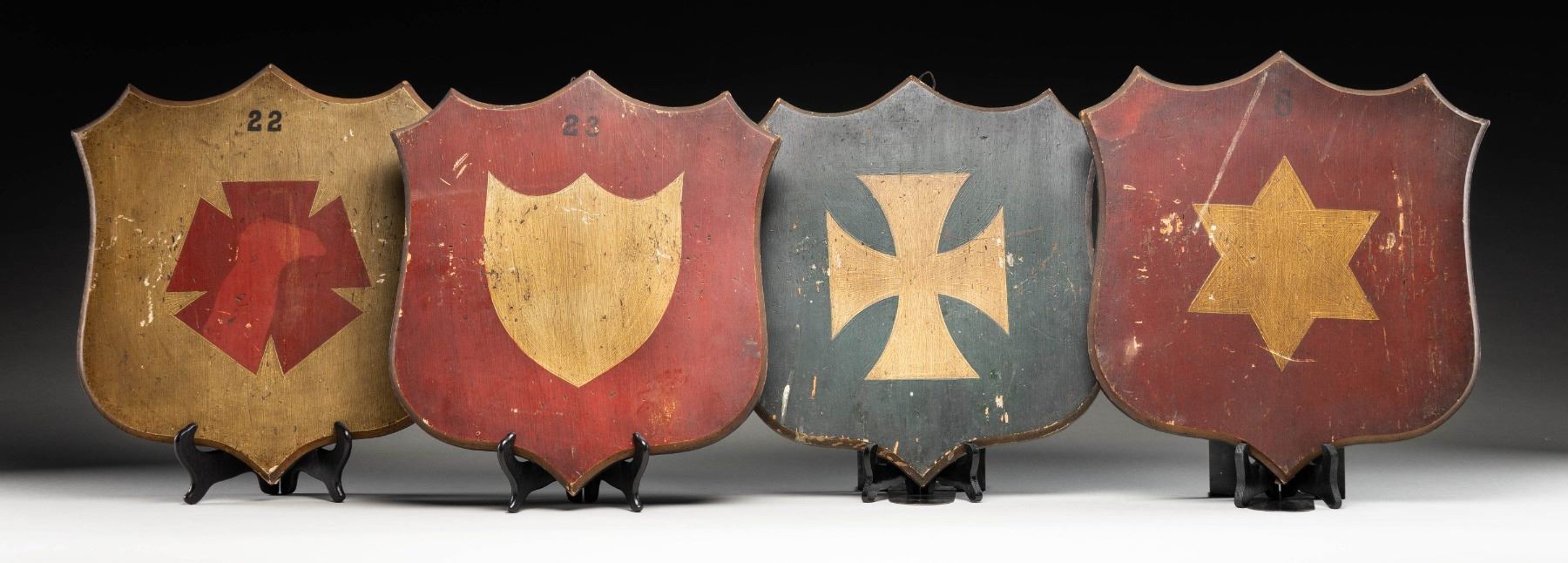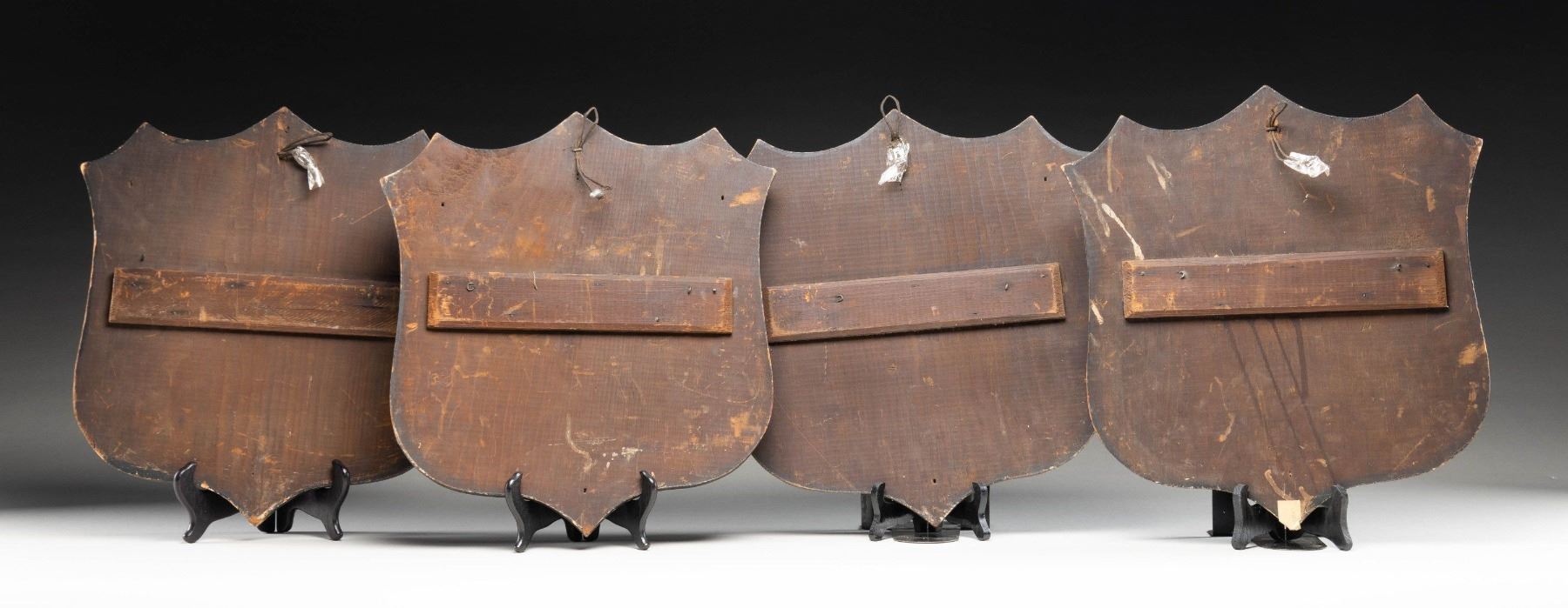 4 EARLY PAINTED WOODEN SHIELDS FOR HEADQUARTERS
