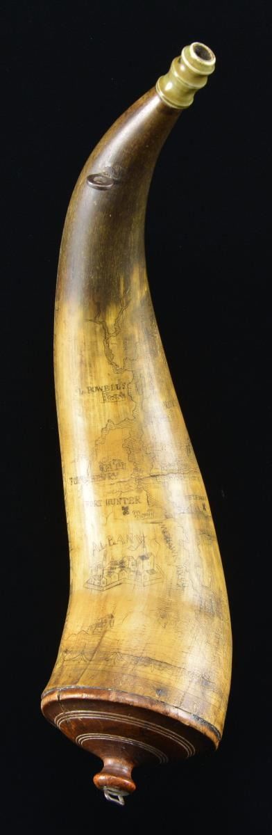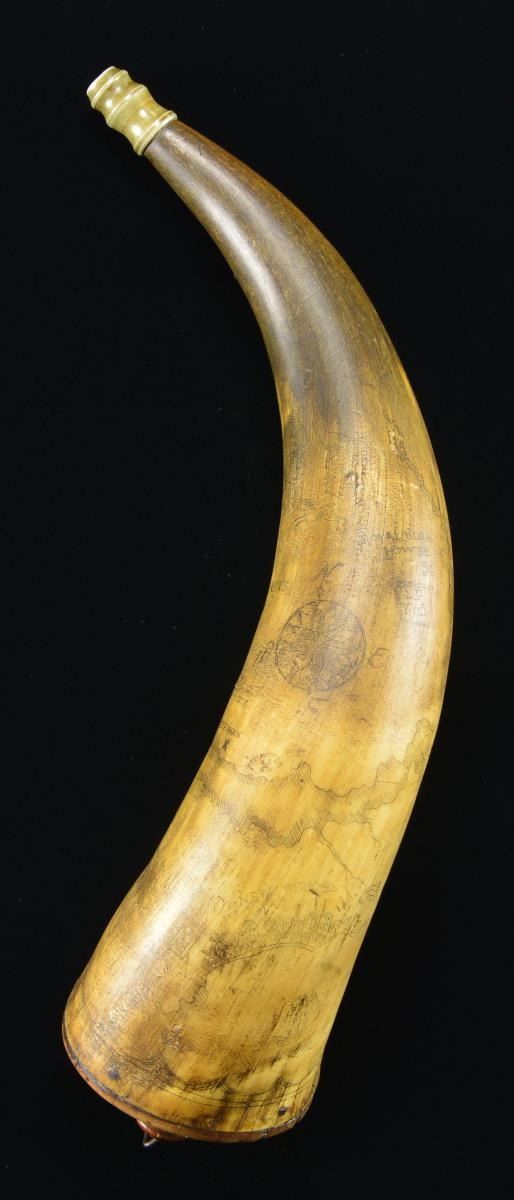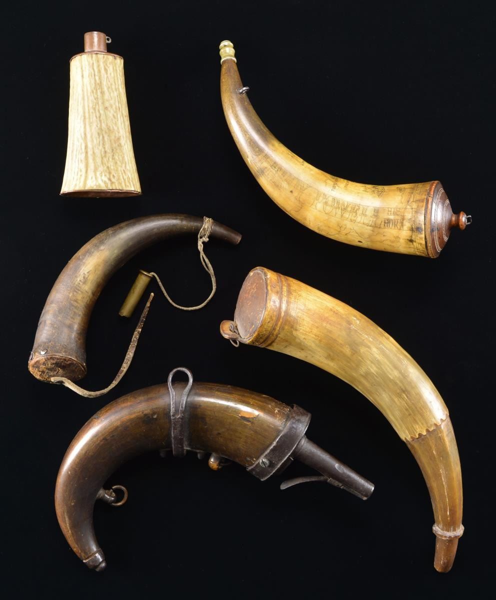 1) Overall length: 12". A nice early horn with a turned wooden plug and a turned bone spout. This early horn was engraved in the 20th century in the style of the 18th century likely by a reenactor. 2) Overall length: 15". A nice large early horn with lineal decoration at the butt and 10 sided carving leading to the spout. There are small losses to the ring near the spout. 3) Overall length: 12 1/2". A fine early iron bound artillery priming horn. The horn has a dark body with an iron, non-functional spout and a large iron charging mechanism at the butt. There are 2 iron rings for suspension and a large iron carrying bar. There is a break in the horn near the butt but no losses. 4) Overall length: 9 3/4". A small plain powder horn of the early 19th century with a 45/70 shell casing tied on used as a powder measure. 5) Overall length: 6 3/8". An interesting powder flask made of a hollowed antler with a copper base & spout. CONDITION: all powder horns & flask show light to moderate wear except as noted. PROVENANCE: From the Collection of James B. Taylor. (02-19899/BF). $500-700.