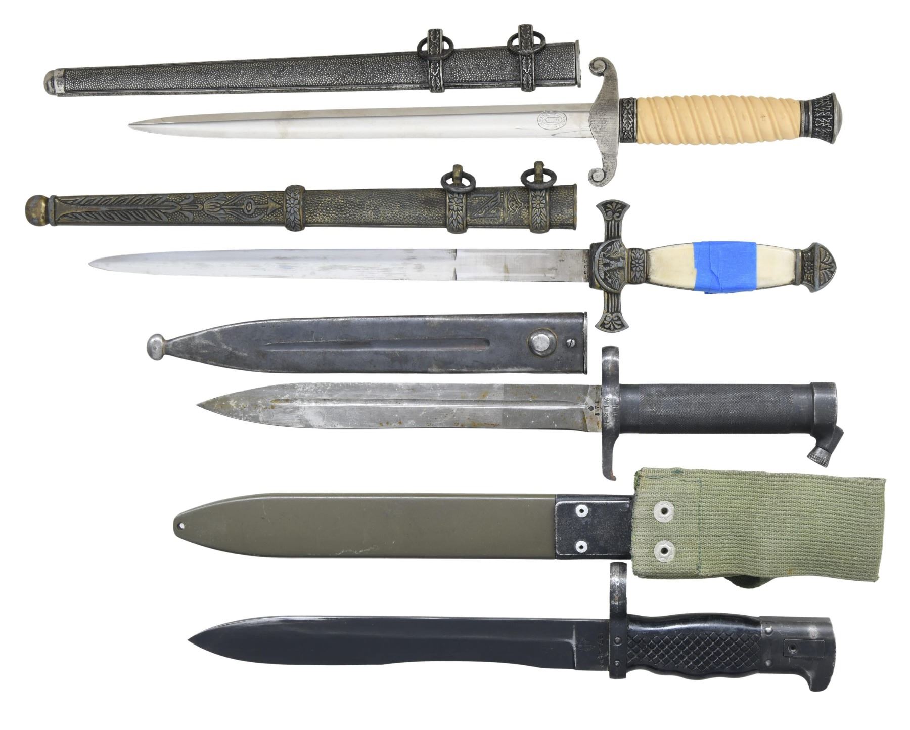 This lot includes 1 Mauser FR8 bayonet and scabbard. Measuring 14" overall, with an OD cotton canvas belt loop. / 1 Swedish Model 1896 bayonet and scabbard, measuring 13 3/4" overall, with its scabbard. / 1 reproduction Napoleonic dagger, measuring 16 1/4" overall, with its scabbard. CONDITION: all items generally show light wear with no notable damage. (02-23658/BF). NON-GUN. $150-250.