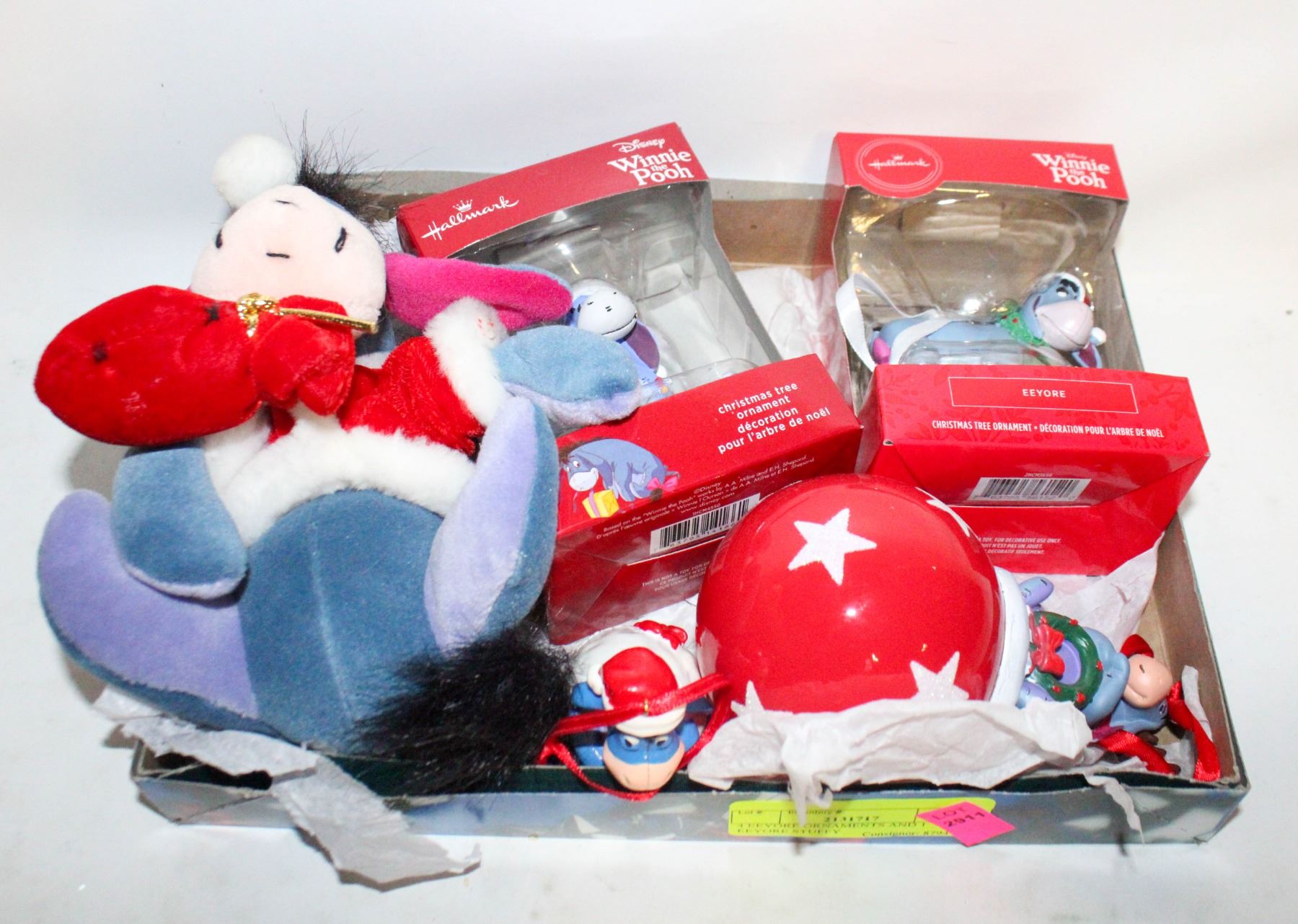 4 EEYORE ORNAMENTS AND 1 EEYORE STUFFY