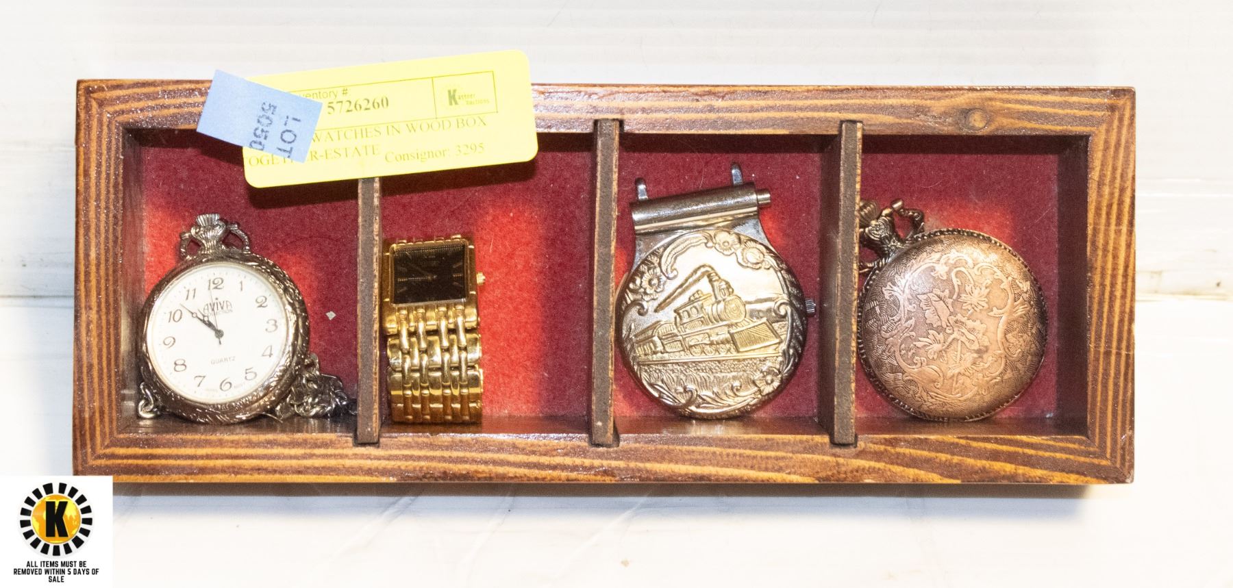 4 ESTATE WATCHES IN WOOD BOX TOGETHER-ESTATE