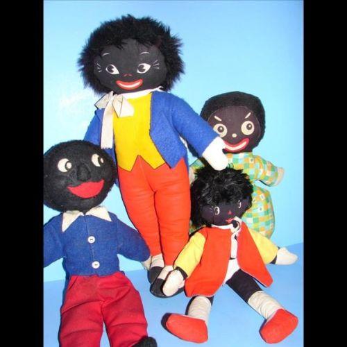 4 Early Golliwogs 4 Early Golliwogs measuring 13", 12" and two at 17". Wearing 2 with Blue Coats, 1