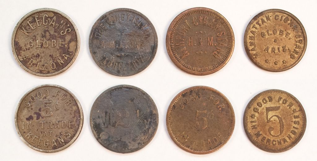 (4) THE CONEY ISLAND // 12½ Brass, KEEGAN'S // 5¢ WM, NEWPORT CIGAR STAND // 5¢ Brass , MANHATTEN CIGAR STAND // 5 Brass