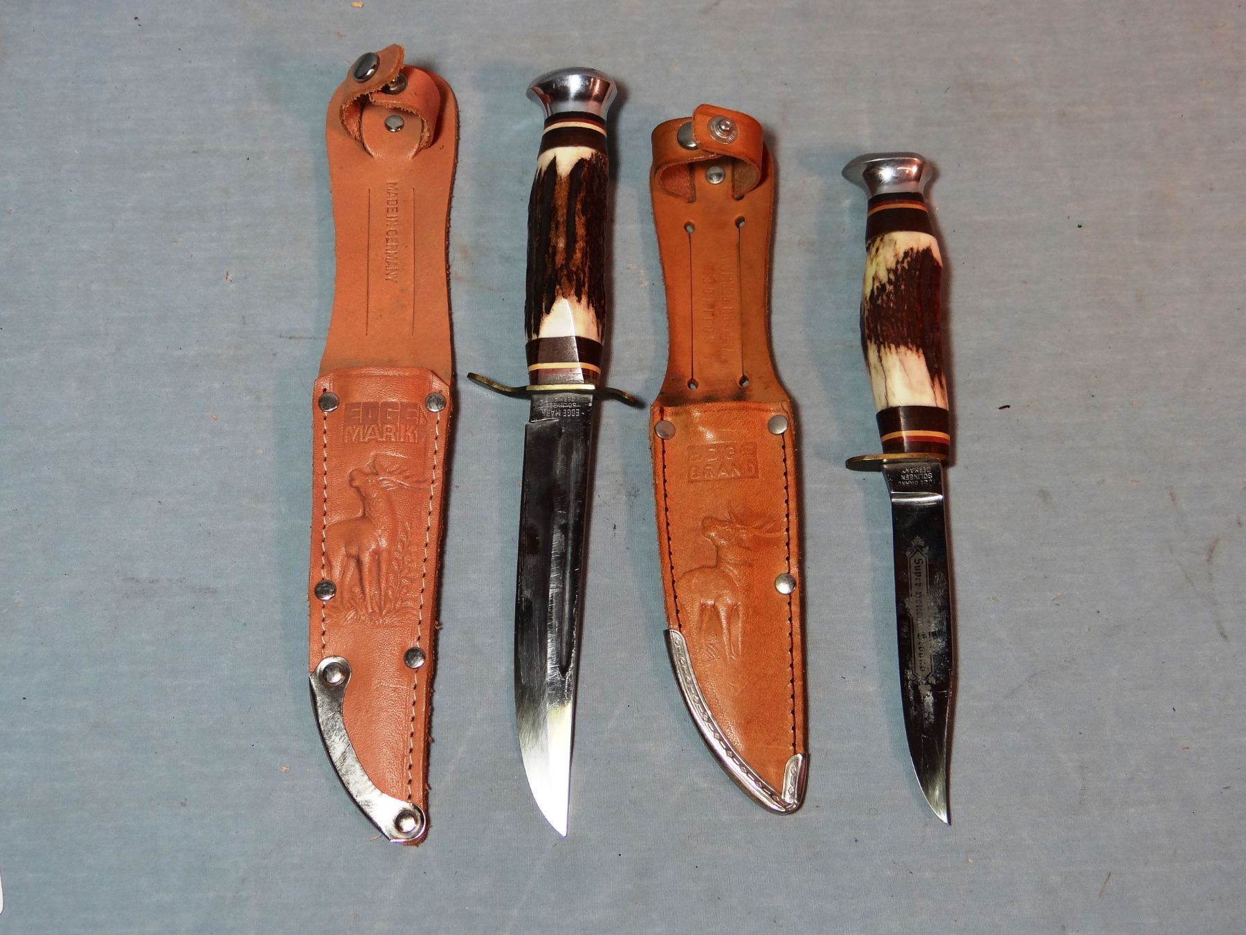 4 Edge Mark hunting knives, new, 5" and 4" w/sheaths