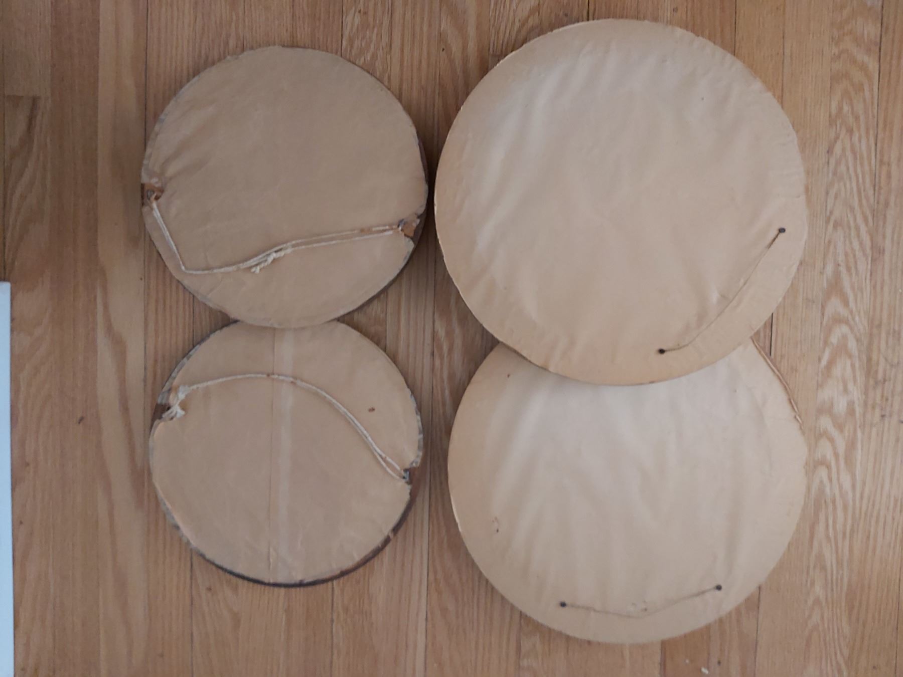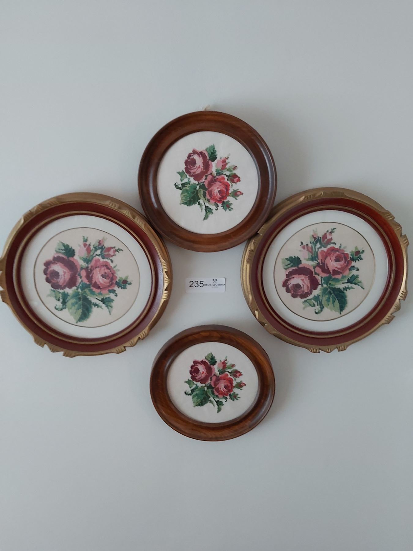 4 Embroidered Flowers in frames 2 are 10 1/2" in circumference and 2 are 8 1/4" in circumference
