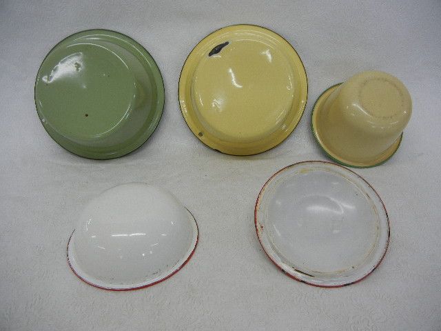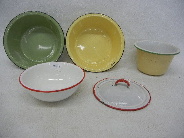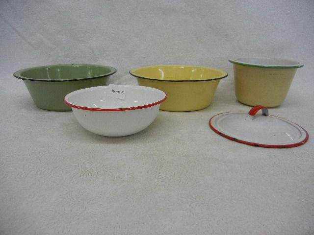 4 Enamelware Pans, 1 Red Rimmed w/ Lid, 1 Green and Black Rim, 1 Yellow and Black Rim, and 1 Tan and Green Rim