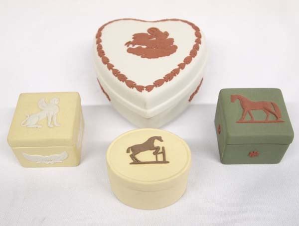 4 English Wedgewood Bisque Porcelain Trinket Boxes, largest measures 4'' x 4'', includes Terra Cotta on Green Wedgewood Jasperware Bisque Porcelain Trinket Box, Terra Cotta on Cream Jasperware Heart Shaped Trinket Box, Brown on Primrose Yellow Trinket Box, and Cream on Primrose Yellow Trinket Box, all are hallmarked