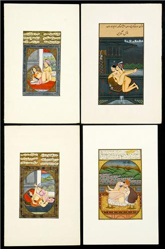 4 Erotic Drawings, c. 1900 Original hand-colored pen and ink drawings, on handmade paper. Size: approx. 4 x 6 in., with Arabic handwriting on the back, with passe-partouts. - Absolutely unique pieces!<Br>