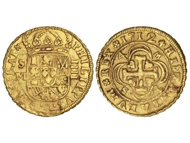 4 Escudos. - 1712. - SEVILLA. - M. - Anv.: S/M-escudo-IIII vertical. Rev.: 4-M/S-4. Ceca, valor y ensayador en anverso y reverso. (Acuñación algo floja, normal en esta pieza). RARA. Cal-278. MBC. - -