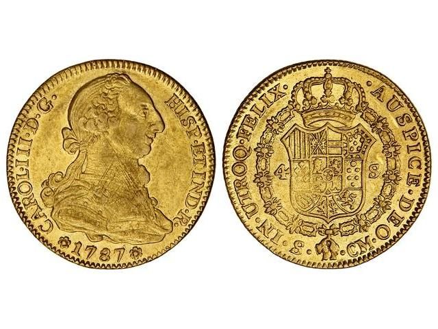 4 Escudos. 1787. SEVILLA. C.M./C.F. Restos de brillo. (Rayitas de ajuste). Cal-411 var. EBC-.