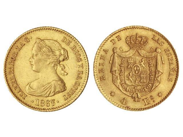 4 Escudos. 1867. MADRID. (Pequeñas rayitas en anverso). Cal-111. MBC+/EBC-.