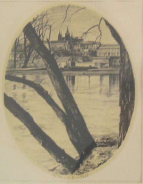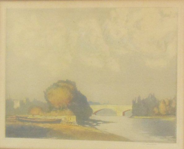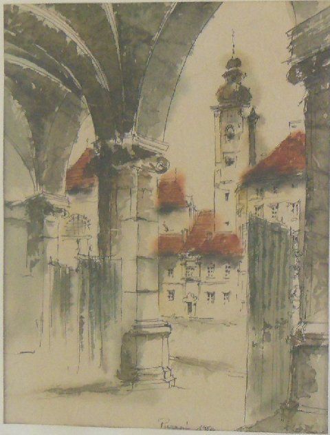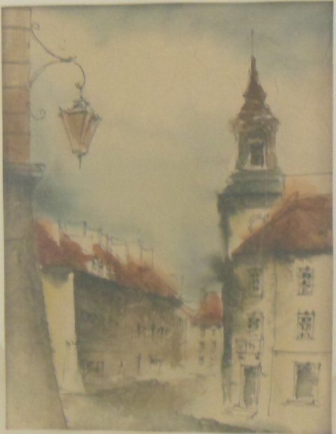 1- Pair "European Town Scenes" in watercolor & ink, signed Pierroni, framed approx. 20" x 16". 1- "European Scene", etching, signed JB. 1989, 46/200, framed approx. 14" x 11". 1- "European Scene", colored etching, pencil signed, framed approx. 15.5" x 18".