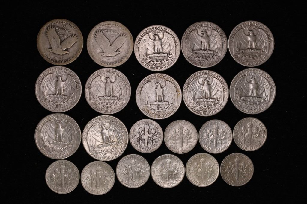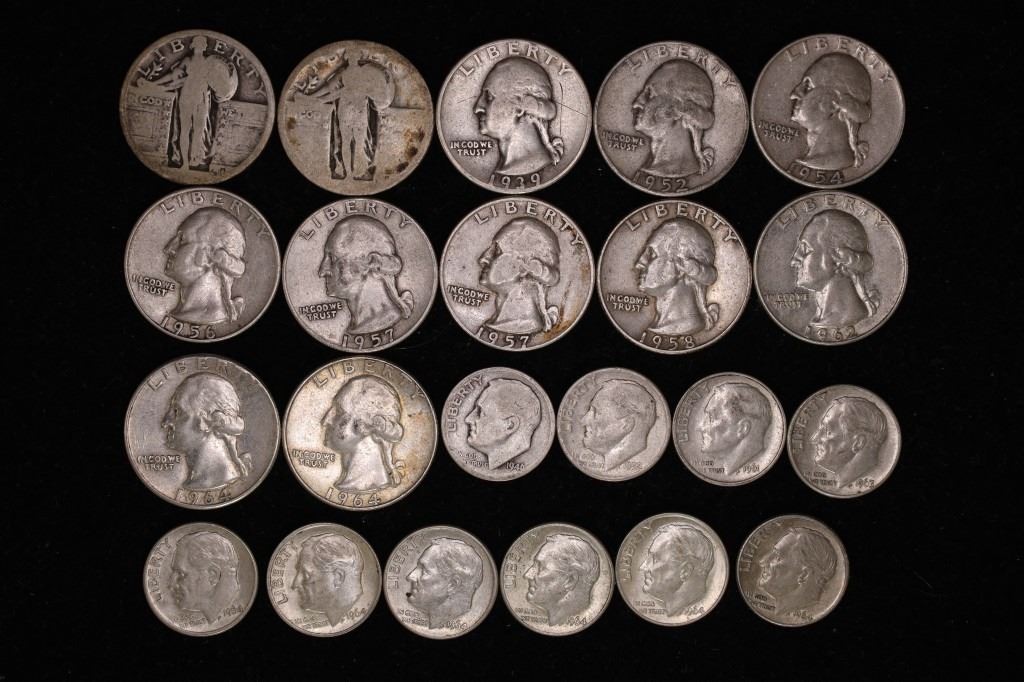 QUARTERS RANGE FROM UNDATED STANDING LIBERTY QUARTERS-1939-1964 AND THE DIMES RANGE FROM 1946-1964. SEE PICTURES. 2.893 OZ. ASW TOTAL