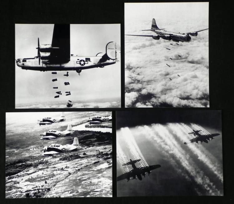 Here are 4 photographs that are showing famous aircrafts in WWII These are 8 x 10 black & white glossy high quality archive reprints. All are in excellent condition. They feature: B-24 Liberator Aircraft Drops Bombs WWIIA-1E Skyraider Formation VietnamB-29 Superfortress Korean War BombingBoeing B-17 Flying Fortress with Contrails