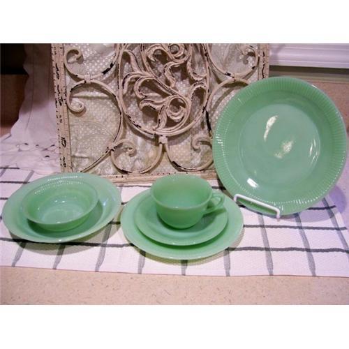 Set of four Fire King Jadeite dinnerware place settings of Six, for a total of 24 pieces. The Pattern is "Jane Ray" Produced from 1946 through 1965. All the pieces are in excellent condition. Beautiful color and shine. The set includes the following; (4) 9 1/8: Dinner plates, (4) 7 3/4" Salad plates, (4) 7 5/8" Soup Plates or shallow soup bowls, (4) berry bowls, (4) 6" saucers, and (4) Cups. Four place settings in all. It's nice to find all the pieces together rather then trying to find one here and there. You'll be very pleased with these.