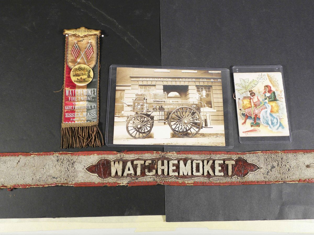 Lot of 4 Firemen's items from Watchemoket, E. Providence, RI. Including ribbon, belt, photo and dance card. Ribbon and belt only in fair condition.