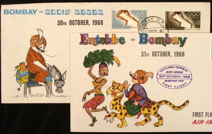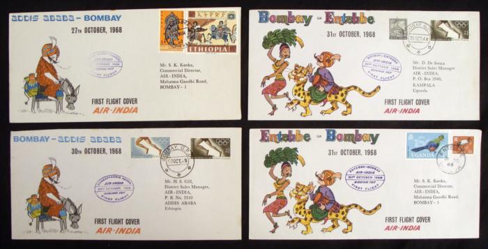 These are 4 first flight covers from Air India, including two round-trip sets, both to and from Bombay and Entebbe, and Addis Ababa. They are in excellent condition. They are dated and postmarked 1968.