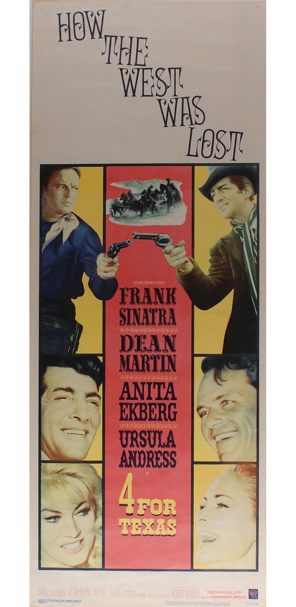 Original color 14 x 36 insert for the 1964 film 4 For Texas, starring Frank Sinatra and Dean Martin. Insert features two images of both Sinatra and Martin, and a banner at top proclaiming “How the West Was Lost.” In fine condition, with scattered light edge creases and toning. Rolled.
