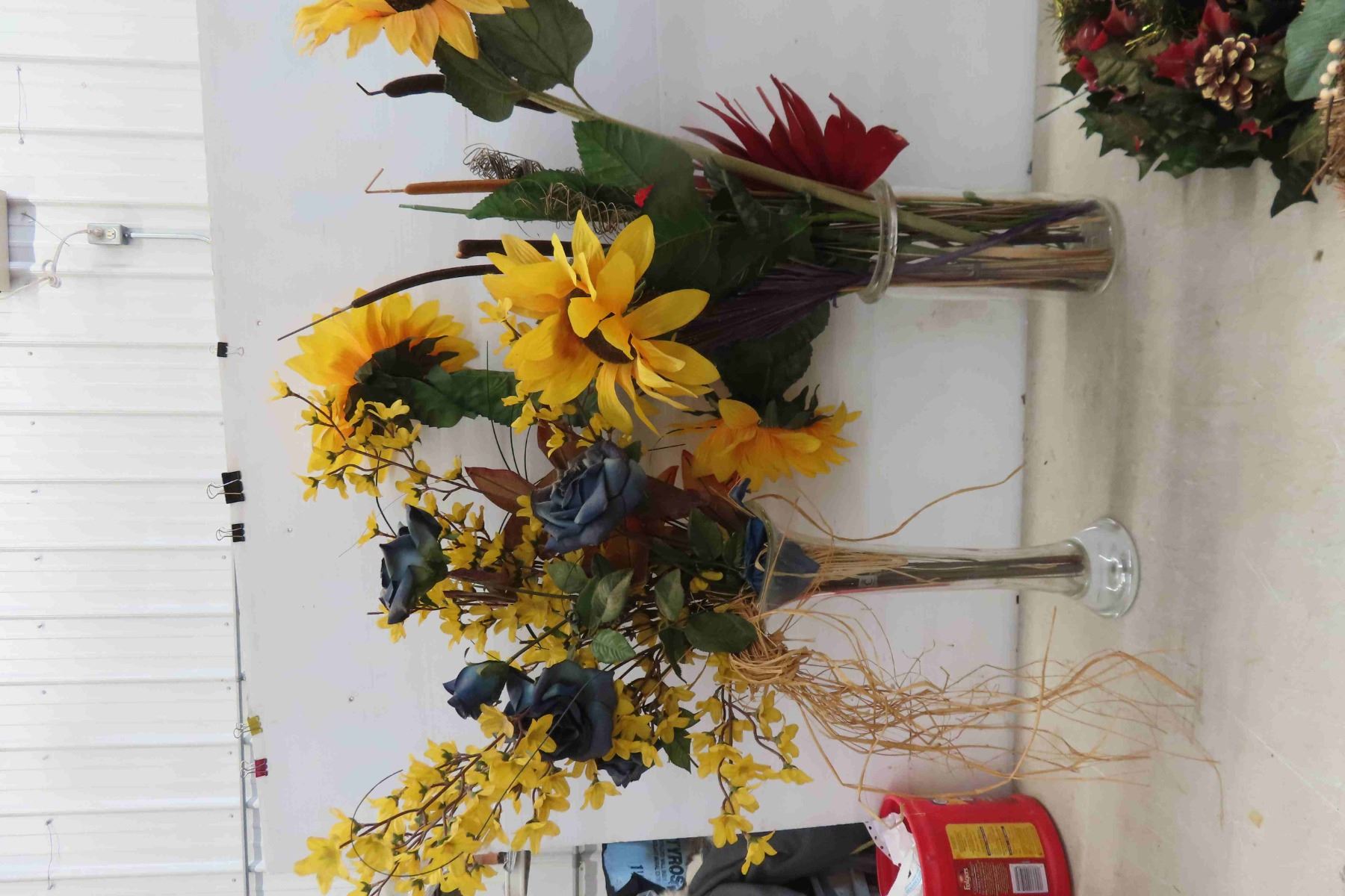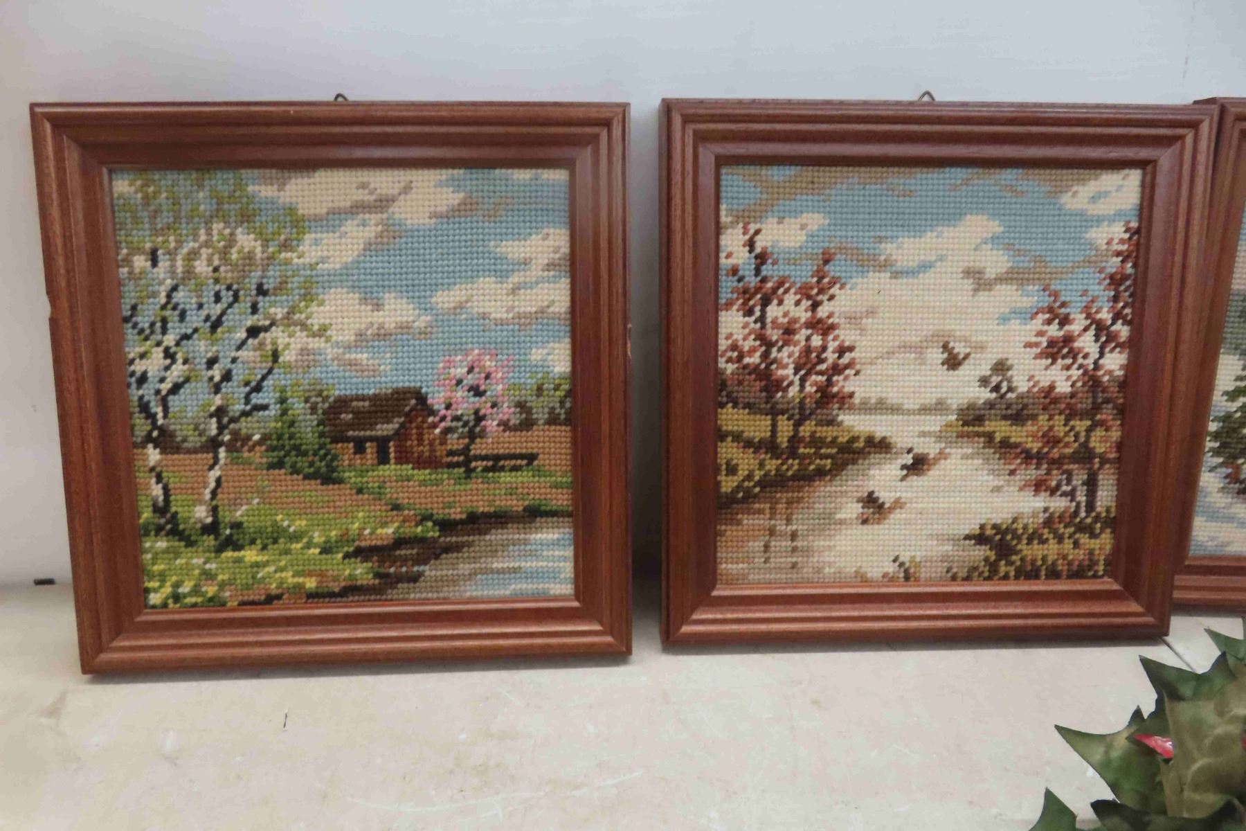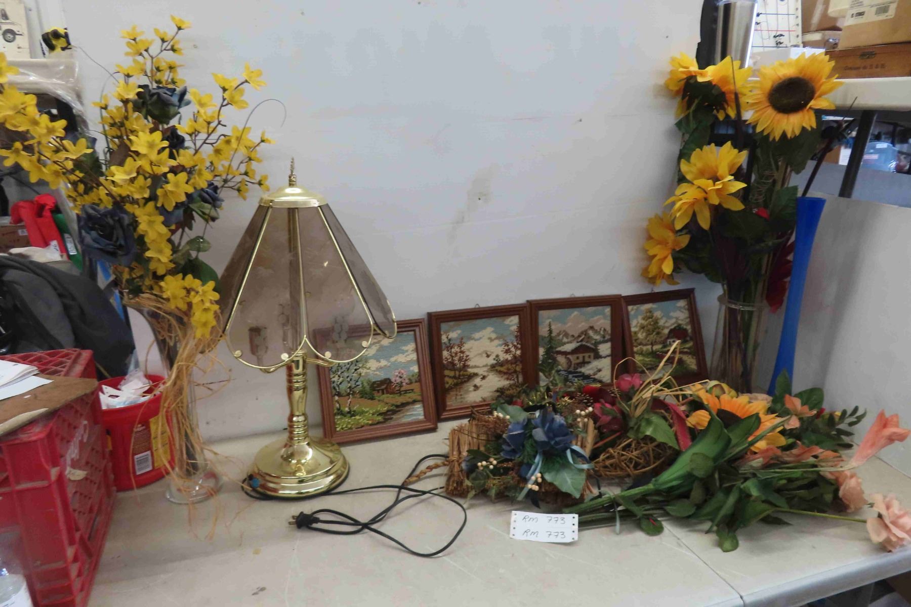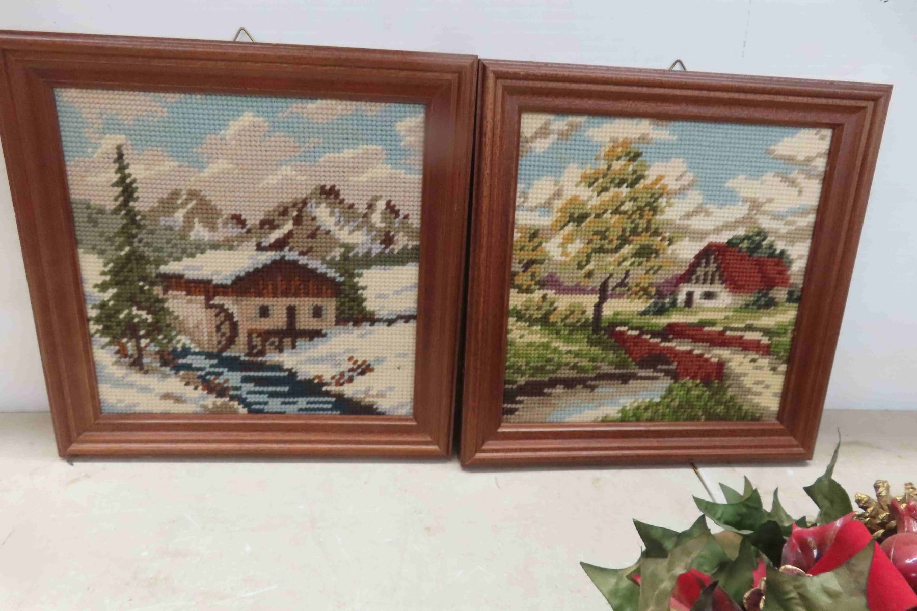 4 Framed Petit Point Pictures 9.5" x10", Vases, Table Lamp, Silk Flowers
