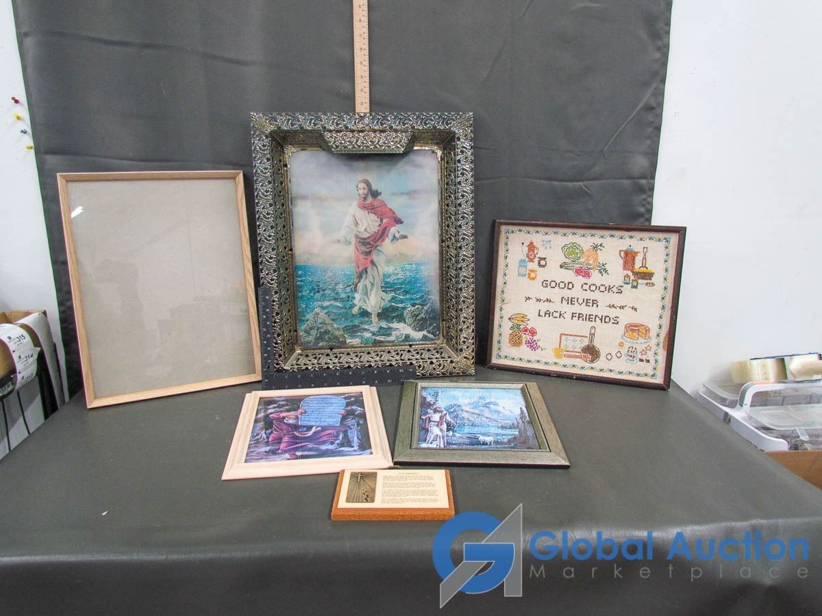 (4) Framed Religious Pictures, Cross Stitched Kitchen Decor and a Empty Frame