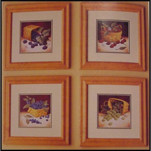Here is a set of FRUIT MEDLEY Prints from Longaberger, discontinued but new in the box, never used!!!!! You get a Cherry, Grapes, Blackberries, and Blueberries. 12.5" x 12.5" framed from Longaberger.