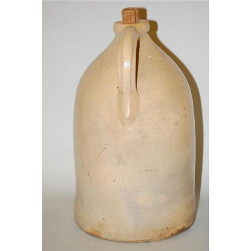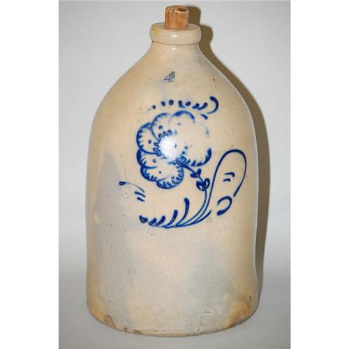 4 GAL. DECORATED STONEWARE JUG - LARGE 18" 4 GAL. STONEWARE JUG W/ LARGE STYLIZED FLOWER DECORATION- UNMARKED (PROBABLY NY STATE) - SEVERAL BASE RIM CHIPS & SMALL HAIRLINES, SMALL CHIPS TO TOP RIM, IMPERFECTIONS