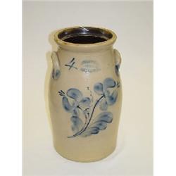 4 GAL. J. FISHER & CO. BUTTERCHURN W/ LARGE DOUBLE FLOWER & SCRIPT 4 - LYONS NY - TOP RIM CHIP & 3" HAIRLINE BACK RIM & SEVERAL SMALL INTERIOR LINES