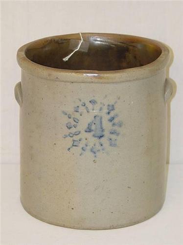4 GAL. STONEWARE CROCK W/ STENCILED #4 W/ COBALT HIGHLIGHTS - GOOD CONDITION;