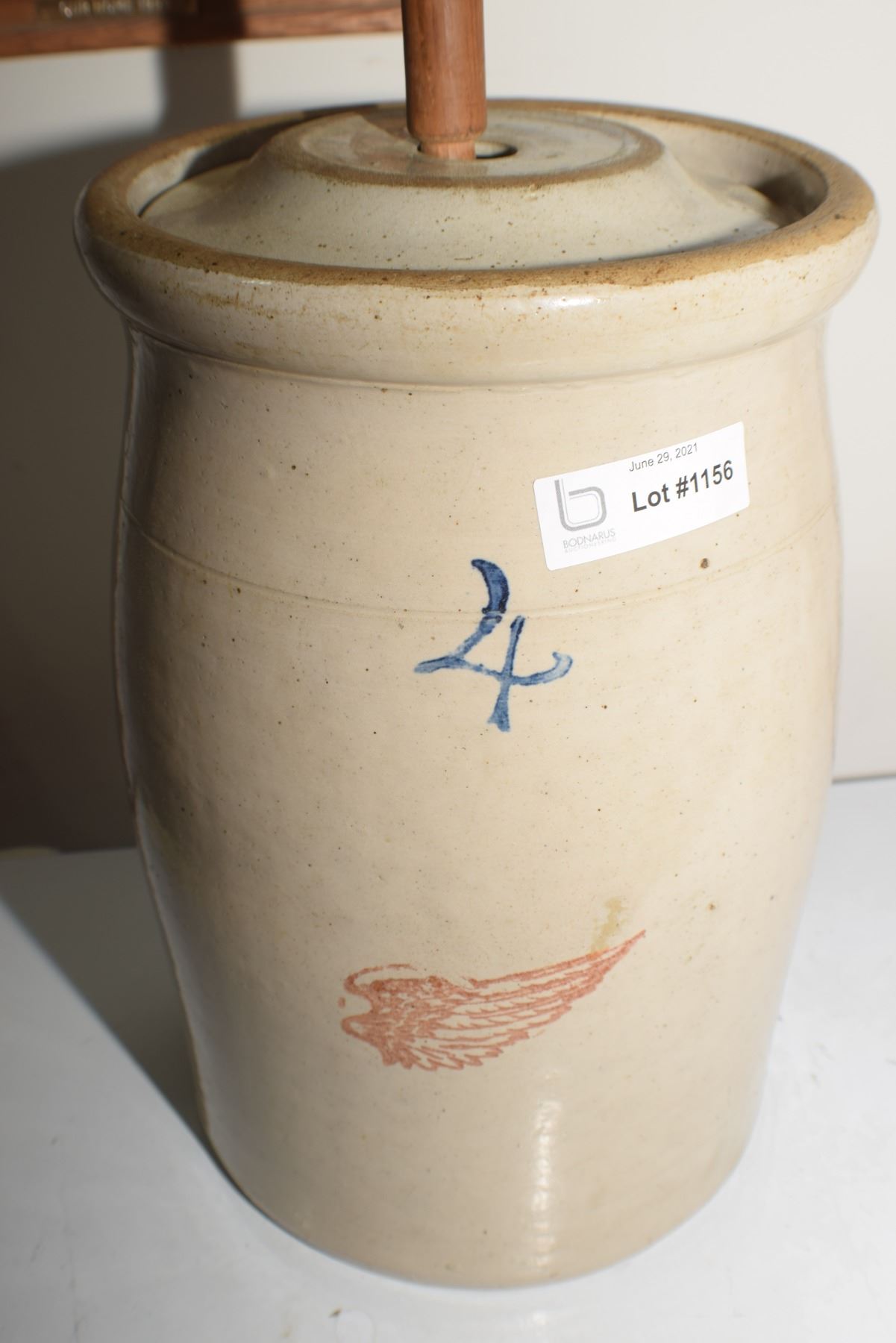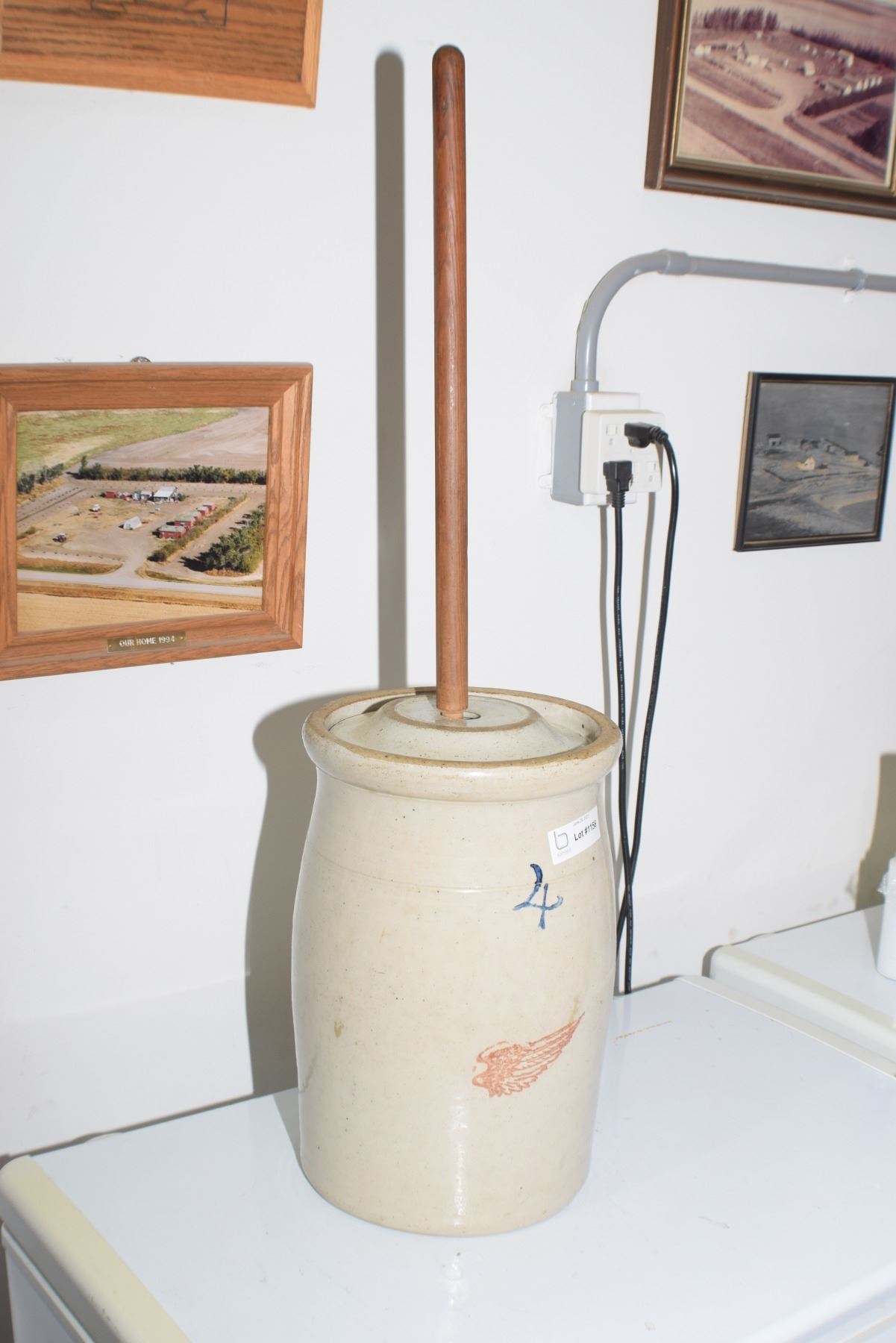 4 GALLON RED WING BUTTER CHURN HAS HAIRLINES